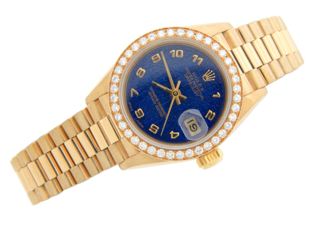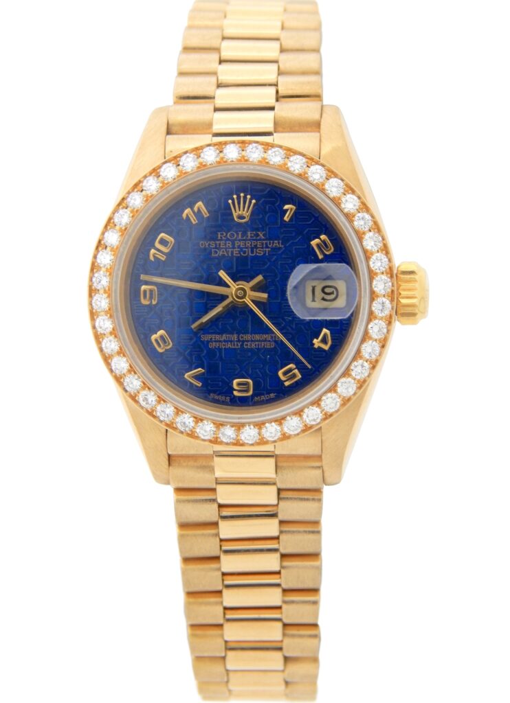 BeckerTime is proud to offer this impressive Ladies 26mm 18k Yellow Gold Rolex Datejust President Watch model ref #69178 with a Blue Anniversary Rolex Arabic Dial and a Rolex FACTORY DIAMOND BEZEL. This is the QUICKSET MODEL with the SAPPHIRE CRYSTAL and a Rolex President Band! This timepiece is in SUPER EXCELLENT CONDITION.