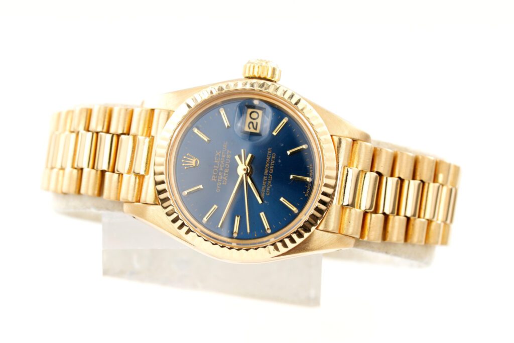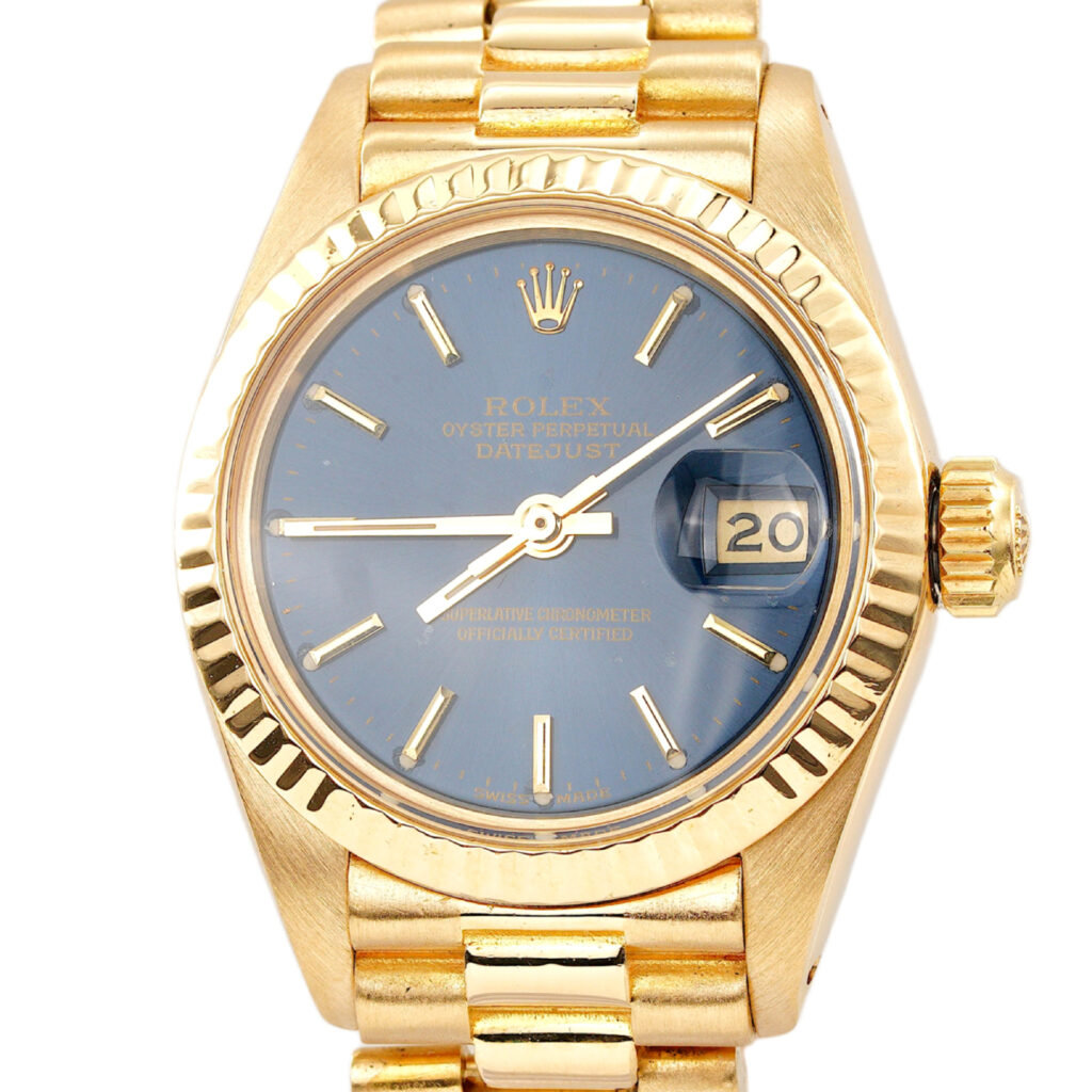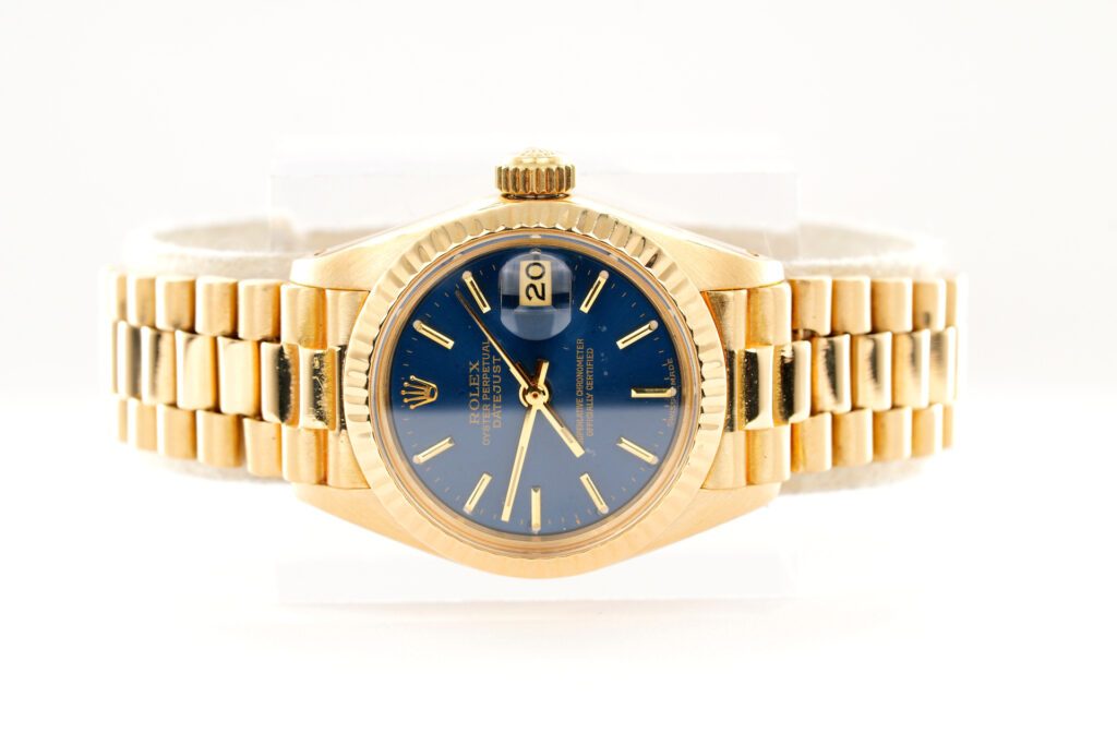 BeckerTime is proud to offer this beautiful Ladies 26mm Solid 18k Yellow Gold Rolex Datejust President Watch ref #6917 with a Blue Dial. And that’s not all…It has a Rolex President band. This timepiece is in EXCELLENT CONDITION.