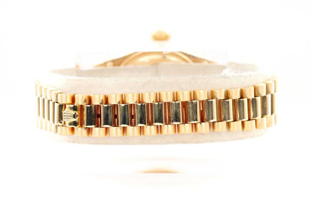 | Band | Rolex 18k yellow gold Presidential bracelet with Rolex signed hidden clasp. Moderate stretch/wear. |