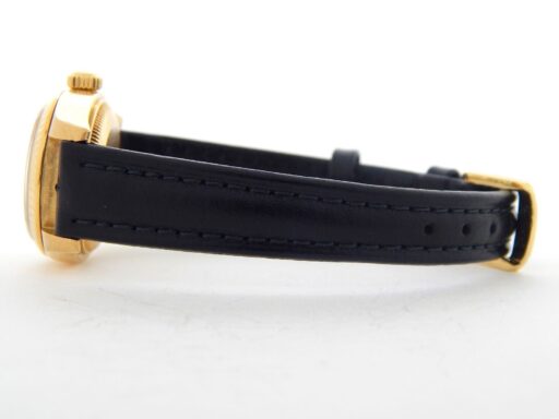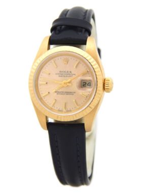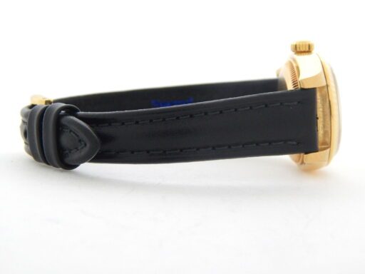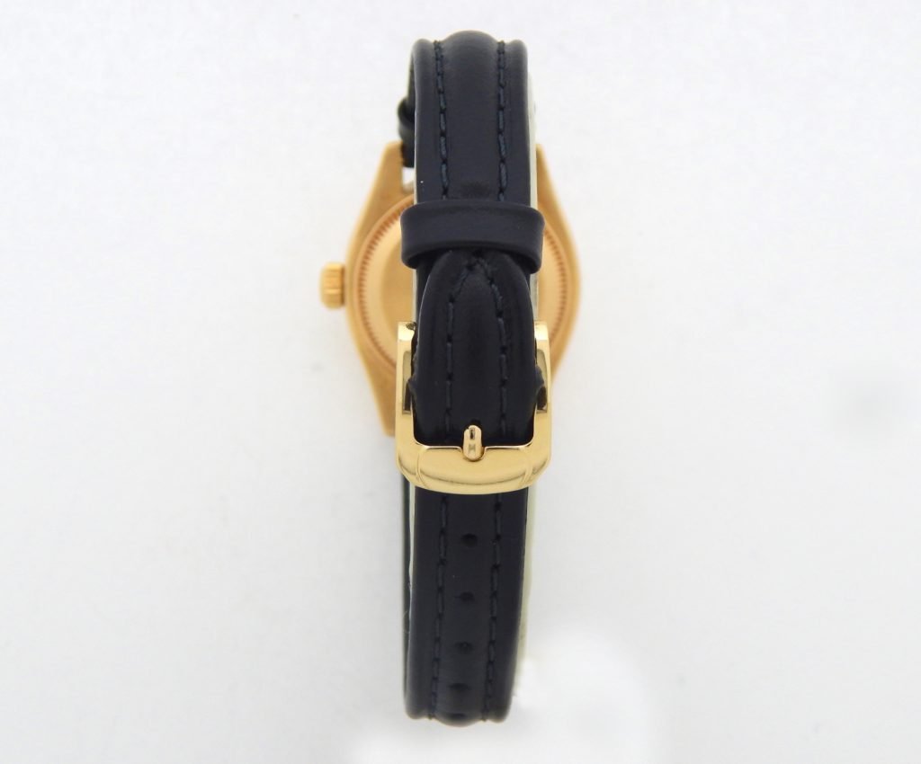 | Band | BLACK leather strap with yellow gold-tone stainless steel buckle. This strap and buckle are not made by Rolex. This is a custom aftermarket leather strap and buckle. |