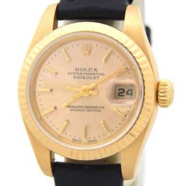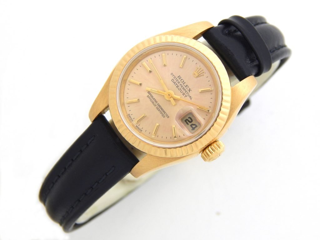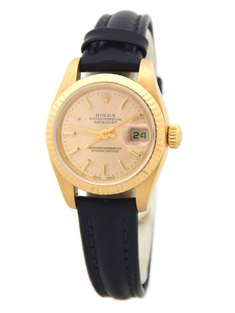 BeckerTime is proud to offer this beautiful Ladies 26mm Solid 18k Yellow Gold Rolex Datejust Watch ref #179178 with a Fluted Bezel and Light Pink Color Dial. This Rolex has been fitted with a custom aftermarket Black leather strap. This timepiece is in SUPER EXCELLENT CONDITION.