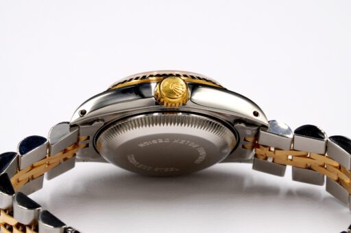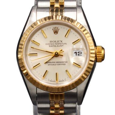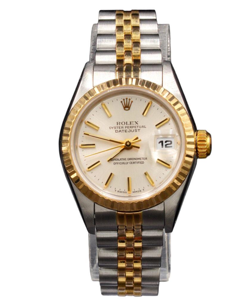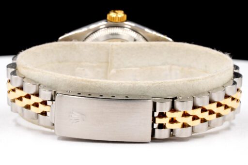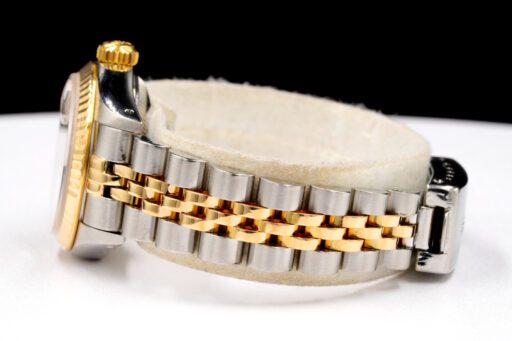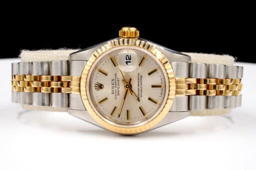 BeckerTime is proud to offer this stunning Ladies 26mm Rolex 2Tone 18K Yellow Gold & Stainless Steel Datejust Watch model ref #69173 with a Silver Dial. And that’s not all…This is the desired QUICKSET MODEL with the SAPPHIRE CRYSTAL and a Rolex Jubilee band. This Rolex is in EXCELLENT CONDITION.