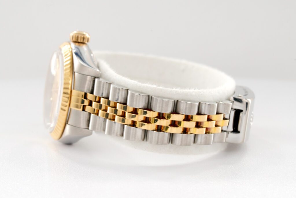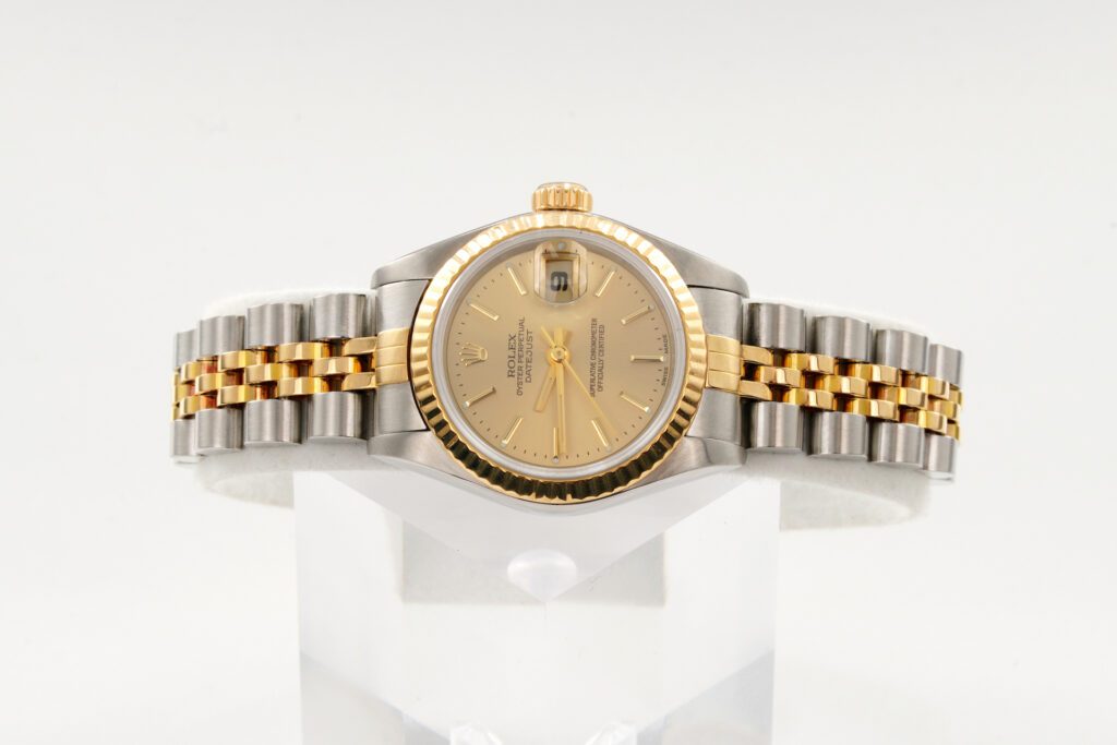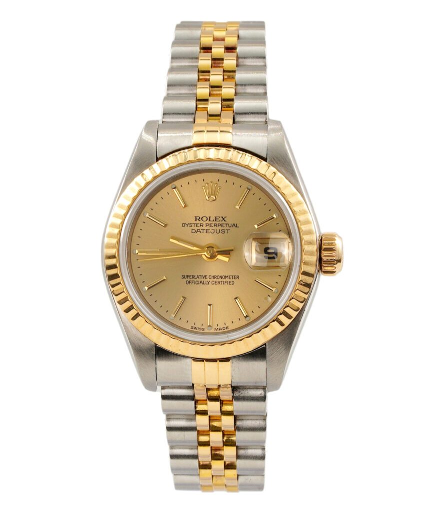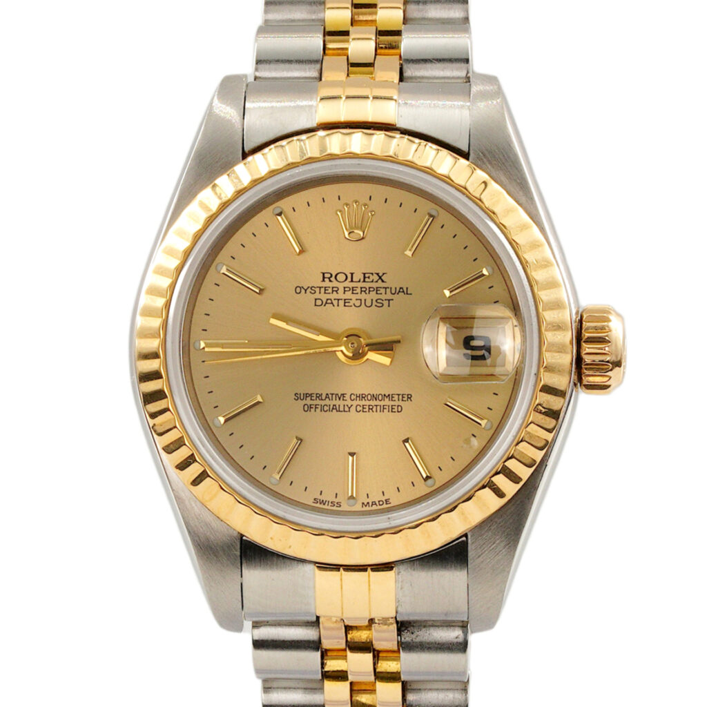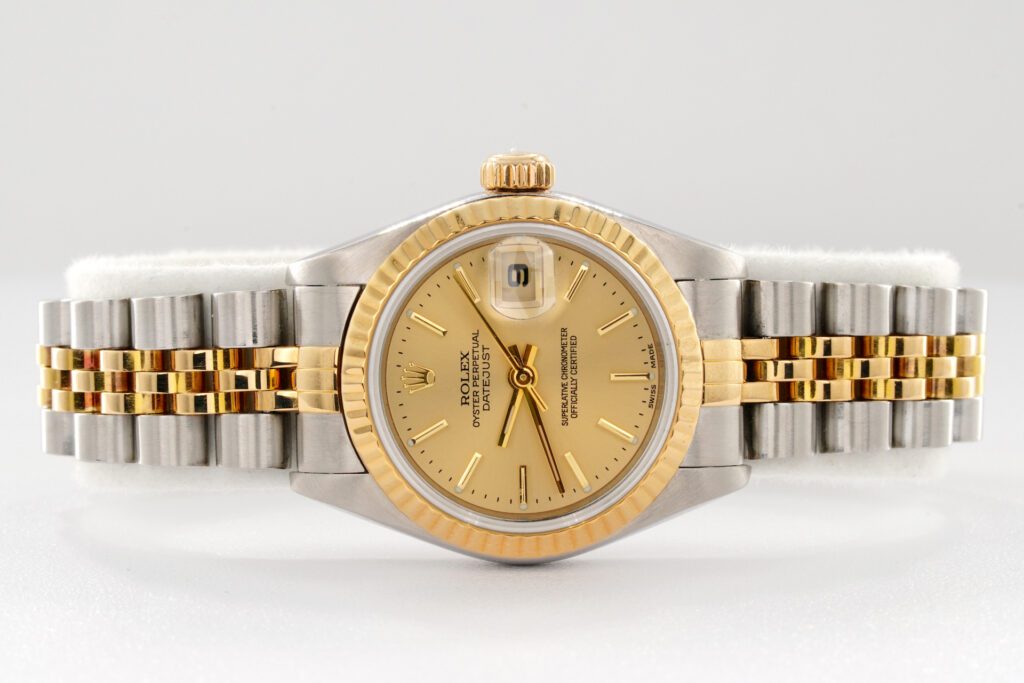BeckerTime is proud to offer this beautiful Ladies 26mm Rolex 2Tone 18K Yellow Gold & Stainless Steel Datejust Watch ref #79173 with a Gold Champagne Dial. This is the desired QUICKSET MODEL with the SAPPHIRE CRYSTAL and a Rolex Jubilee band. This Rolex is from the late 1990’s to early 2000’s and is in SUPER EXCELLENT CONDITION.