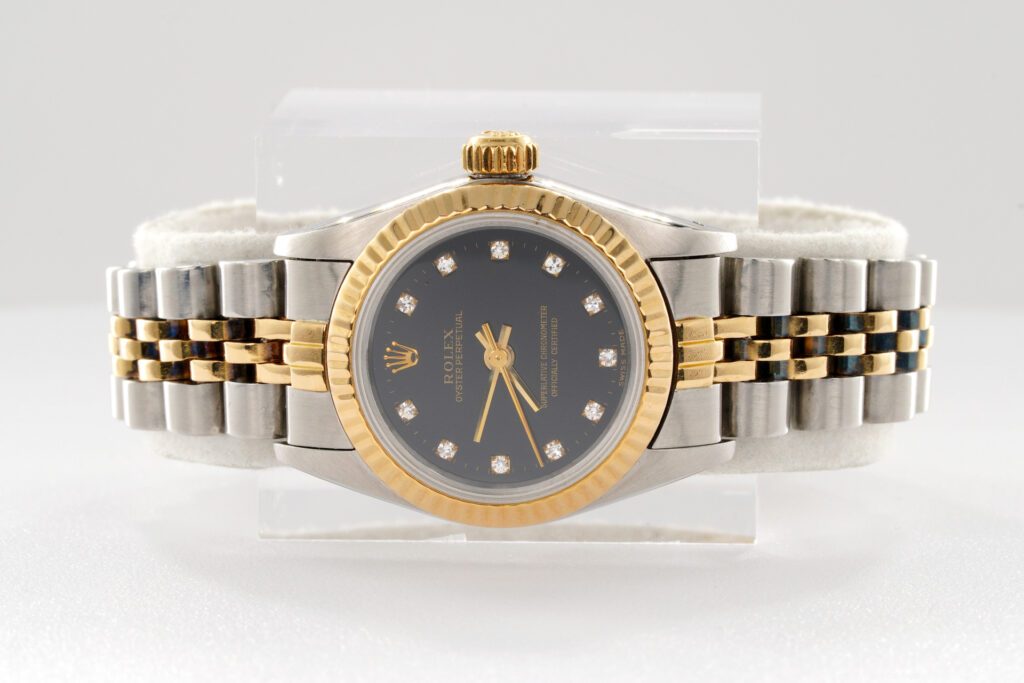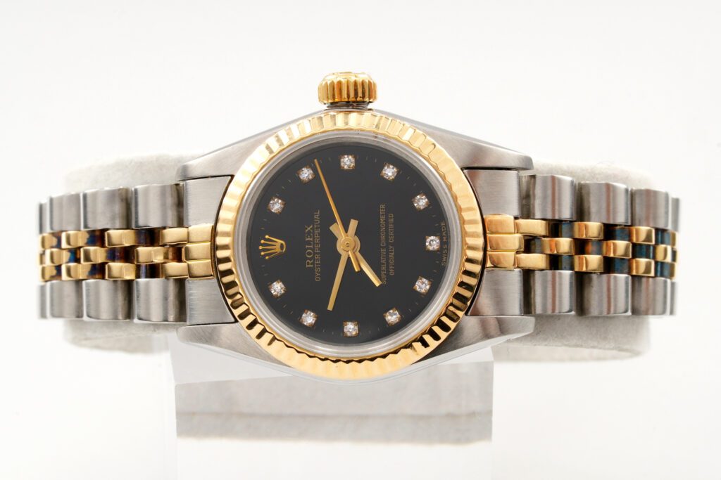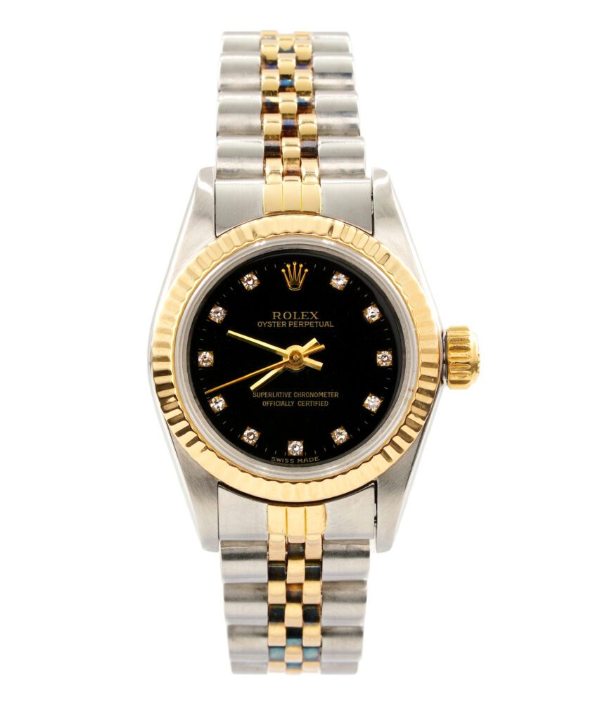 BeckerTime is proud to offer this super nice Ladies 24mm Rolex 2Tone 18K Yellow Gold & Stainless Steel Oyster Perpetual Watch ref #67193 with a Black Diamond Dial. And it get’s better…This is the SAPPHIRE CRYSTAL model with a Rolex Jubilee band. This Rolex is in EXCELLENT CONDITION.
