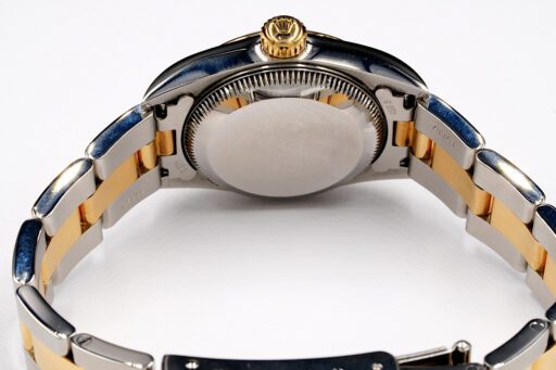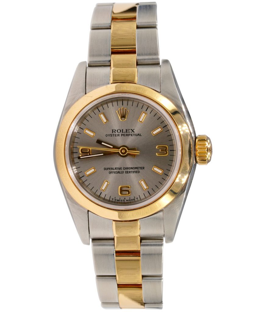 BeckerTime is proud to offer this super nice Ladies 24mm Rolex 2Tone 18K Yellow Gold & Stainless Steel Oyster Perpetual Watch ref #67183 with a Slate Gray Dial. And it get’s better…This is the “NO HOLES” model from the 1990’s with the SAPPHIRE CRYSTAL and a Rolex Oyster band. This Rolex is in SUPER EXCELLENT CONDITION.