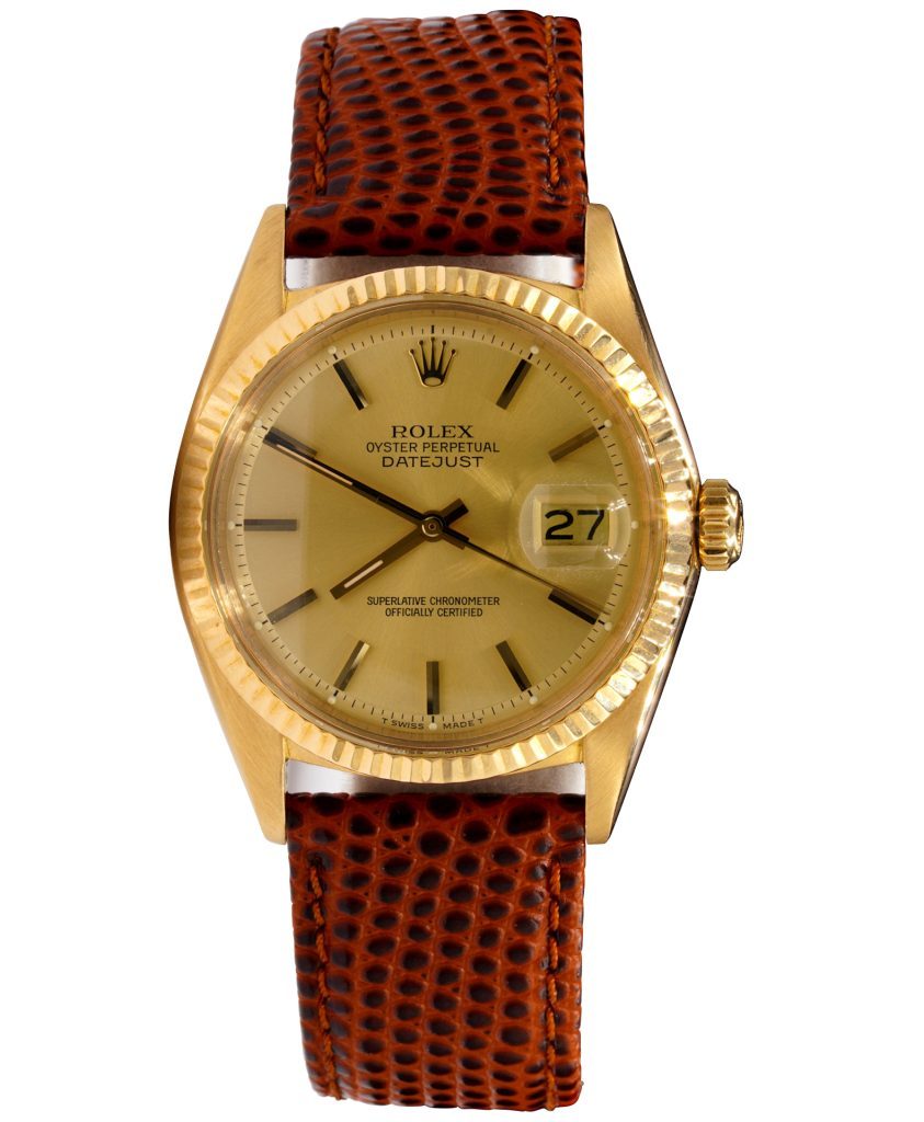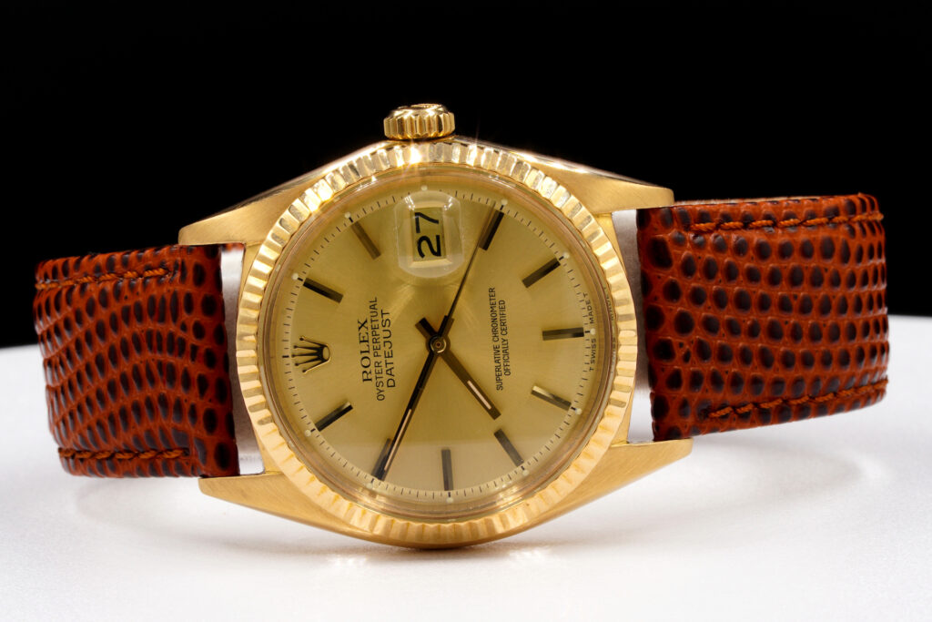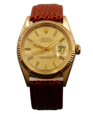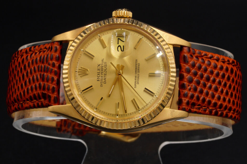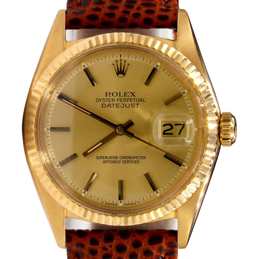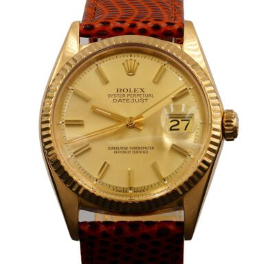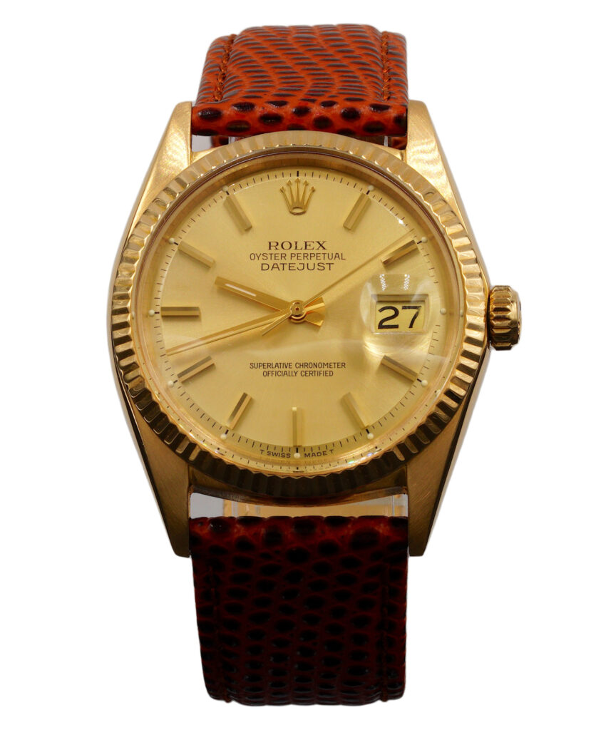 BeckerTime is proud to offer this stunning vintage Men’s 36mm Rolex Solid 18K Yellow Gold Datejust Watch ref #1601 with a Gold Champagne Dial. This Rolex has been fitted with a custom aftermarket Brown leather band. It is in SUPER EXCELLENT CONDITION.