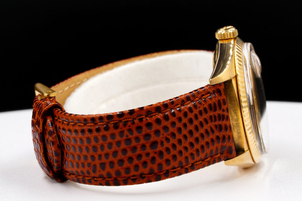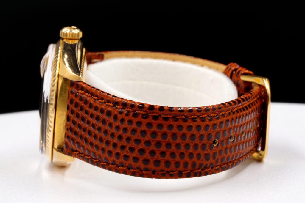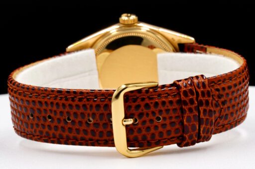 | Band | BROWN leather strap with plain gold buckle. This strap is not made by Rolex as it is a custom aftermarket band. |