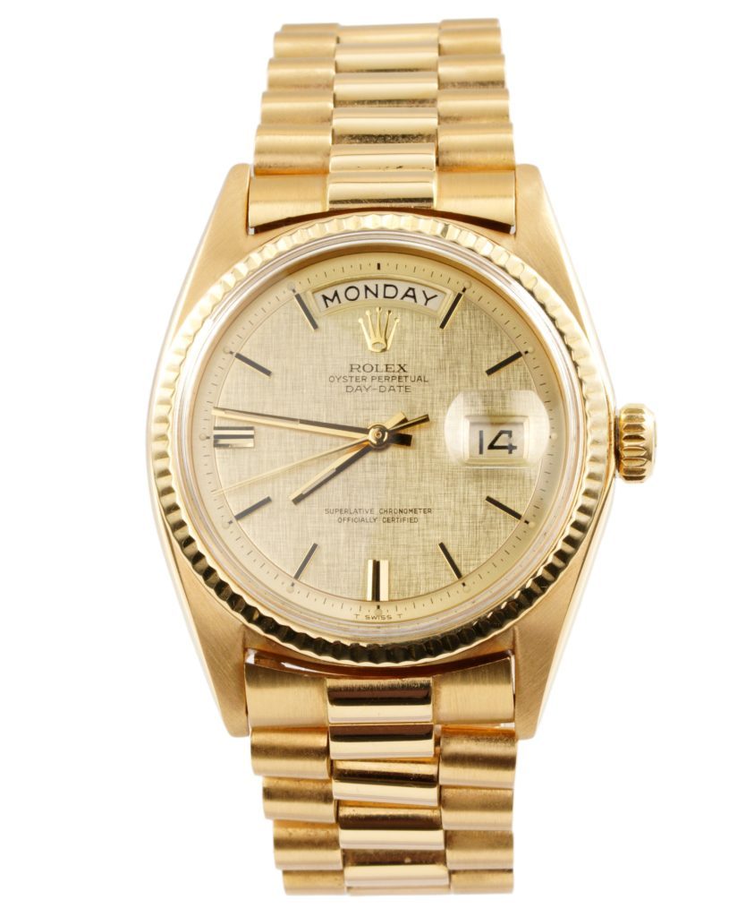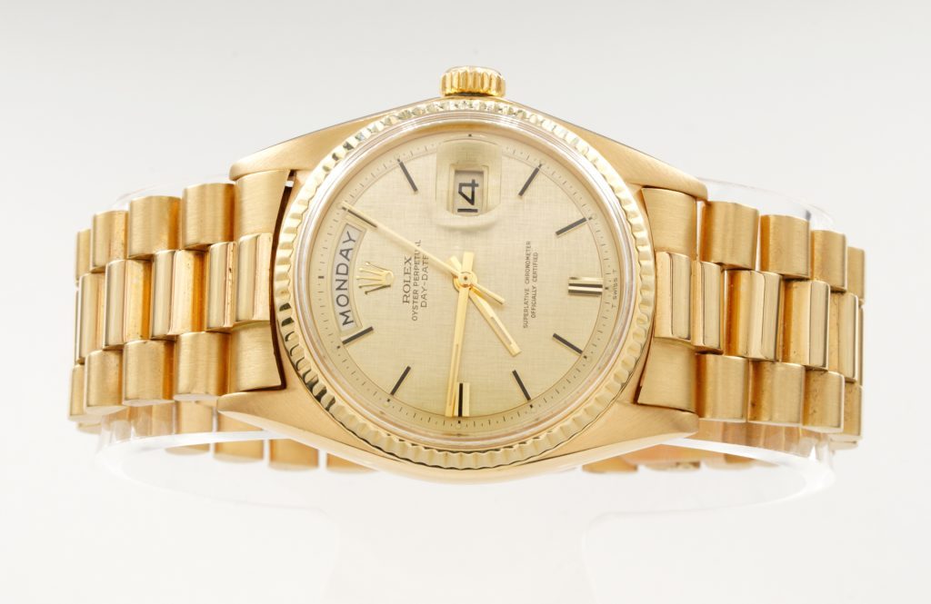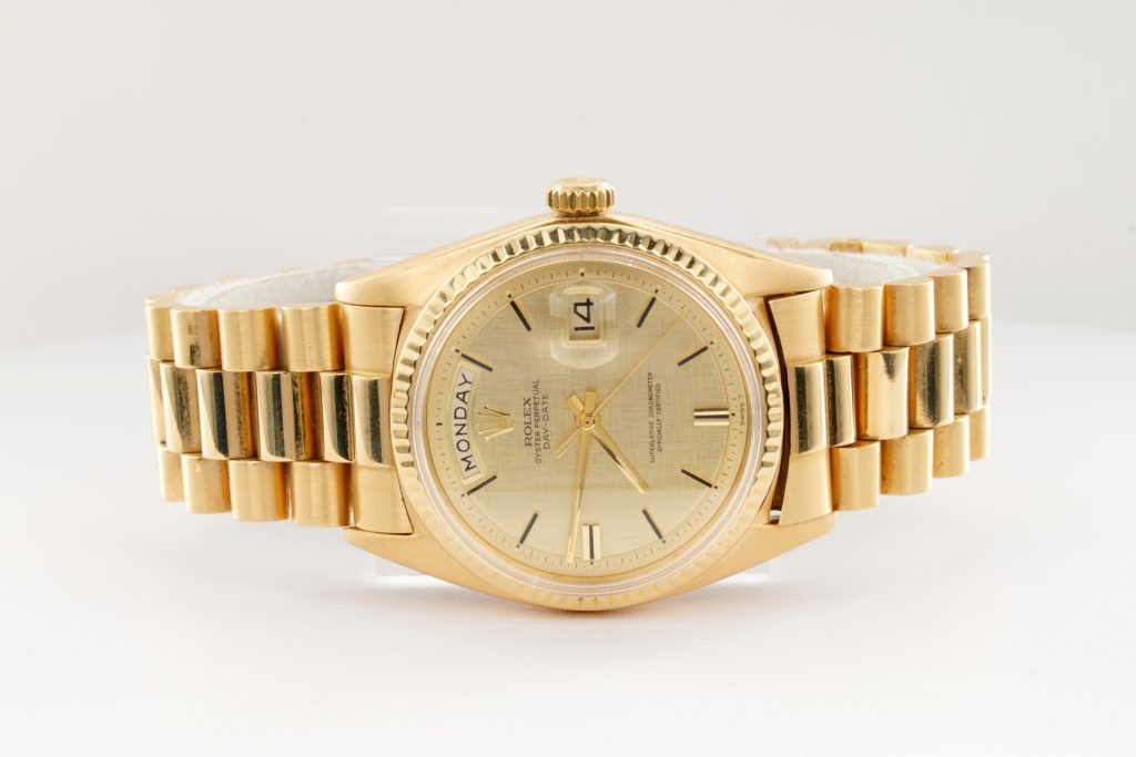 BeckerTime is proud to offer this handsome Men’s 36mm Rolex Solid 18K Yellow Gold Day-Date President Watch ref #1803 with a Gold Linen Dial. It has been fitted with a custom aftermarket presidential style band with hidden clasp. This Rolex is in SUPER EXCELLENT CONDITION.