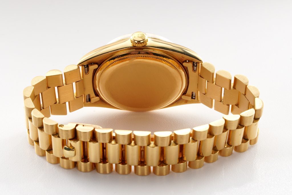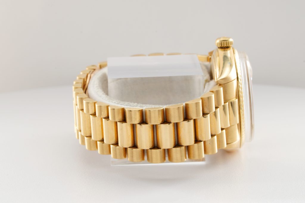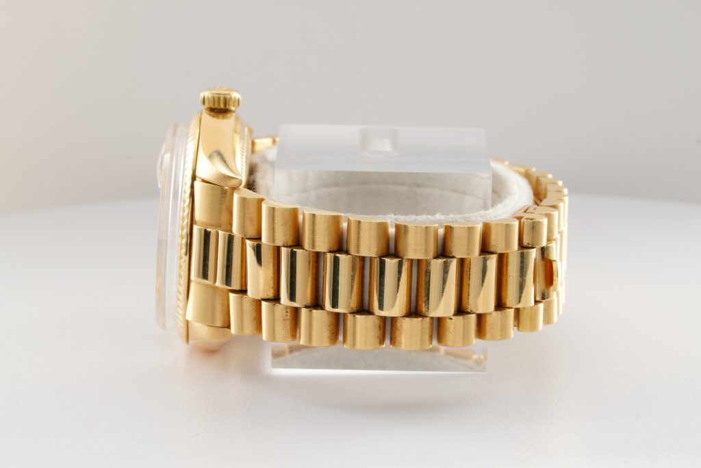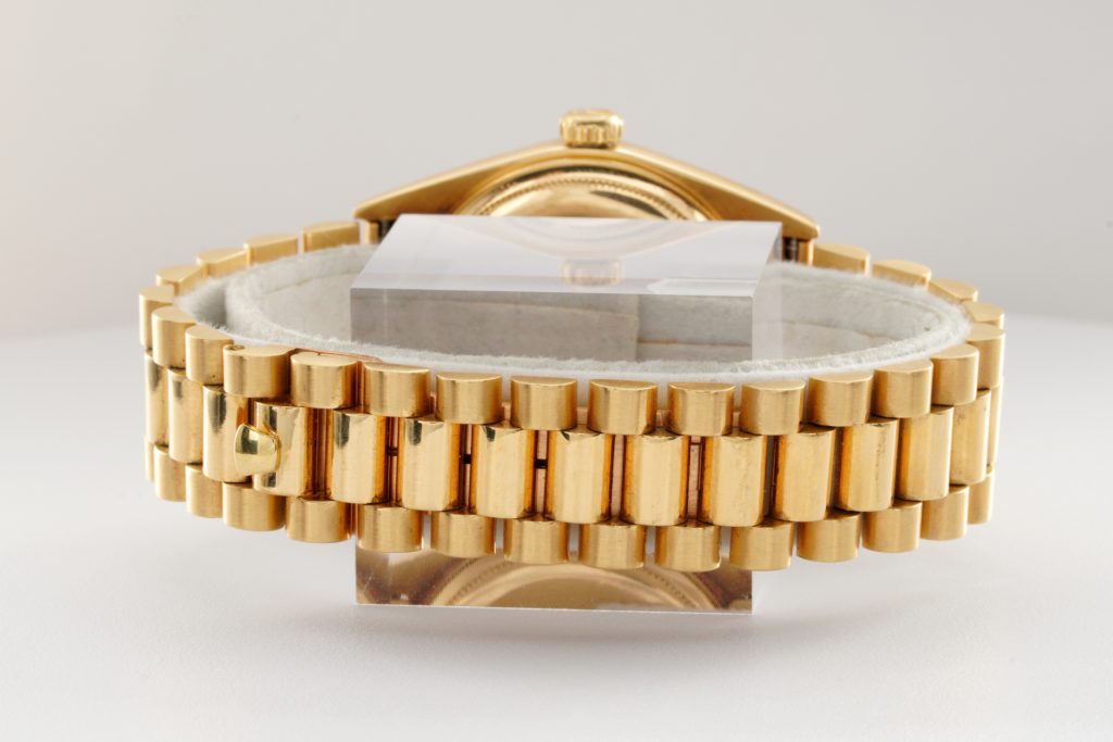 Band 18k yellow gold presidential style bracelet with plain hidden clasp. This band is not made by Rolex as it is a custom Italian made aftermarket band of the highest quality.