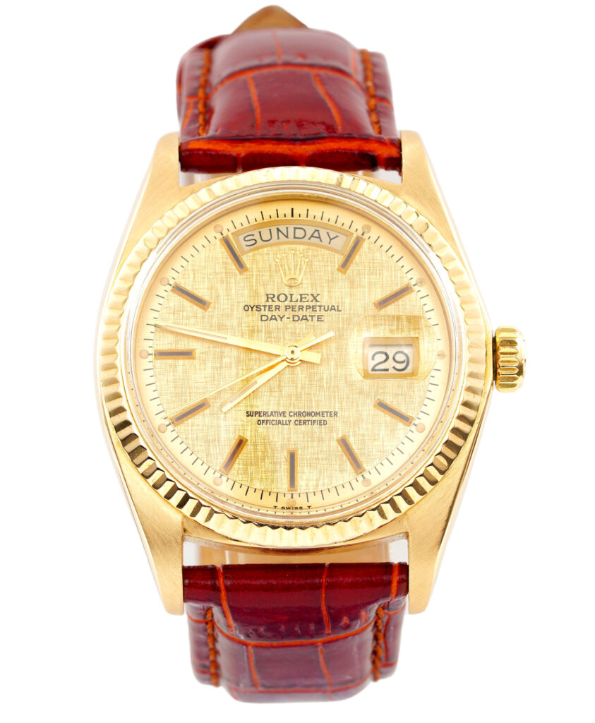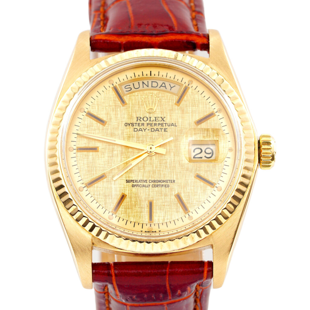 Mens Rolex 18K Yellow Gold Day-Date Watch with Gold Linen Dial 1803 SKU: 3130198AMT