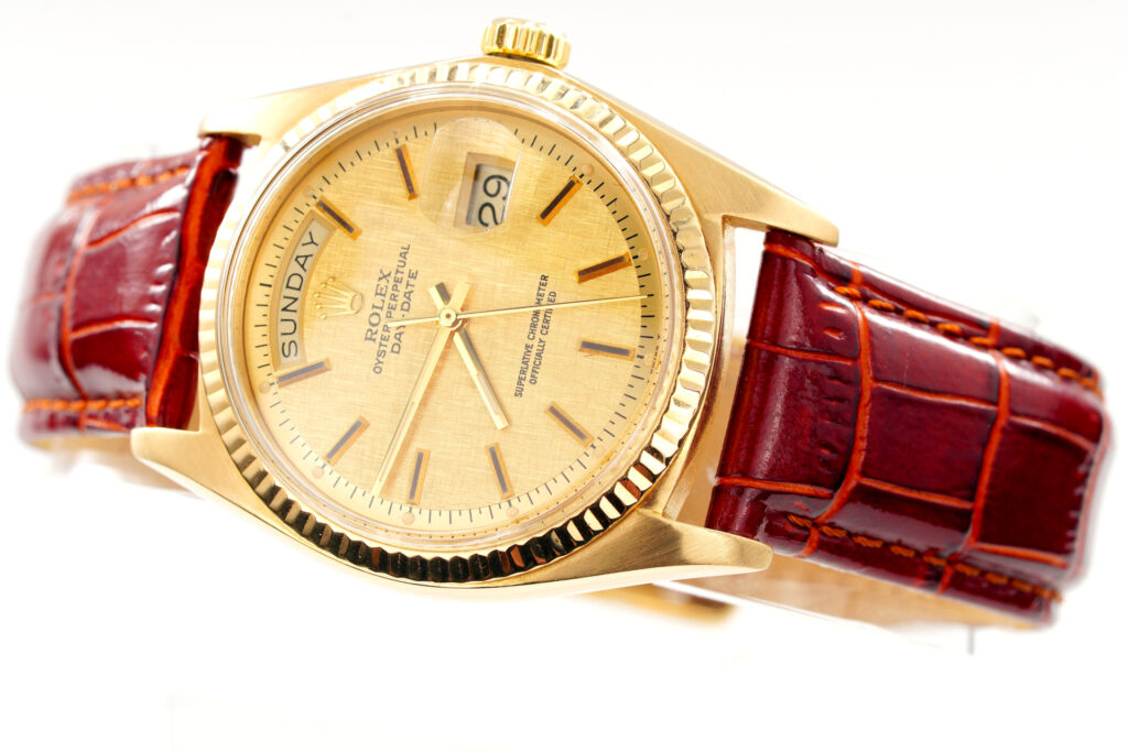 | Dial | Rolex GOLD LINEN dial with raised yellow gold stick markers |