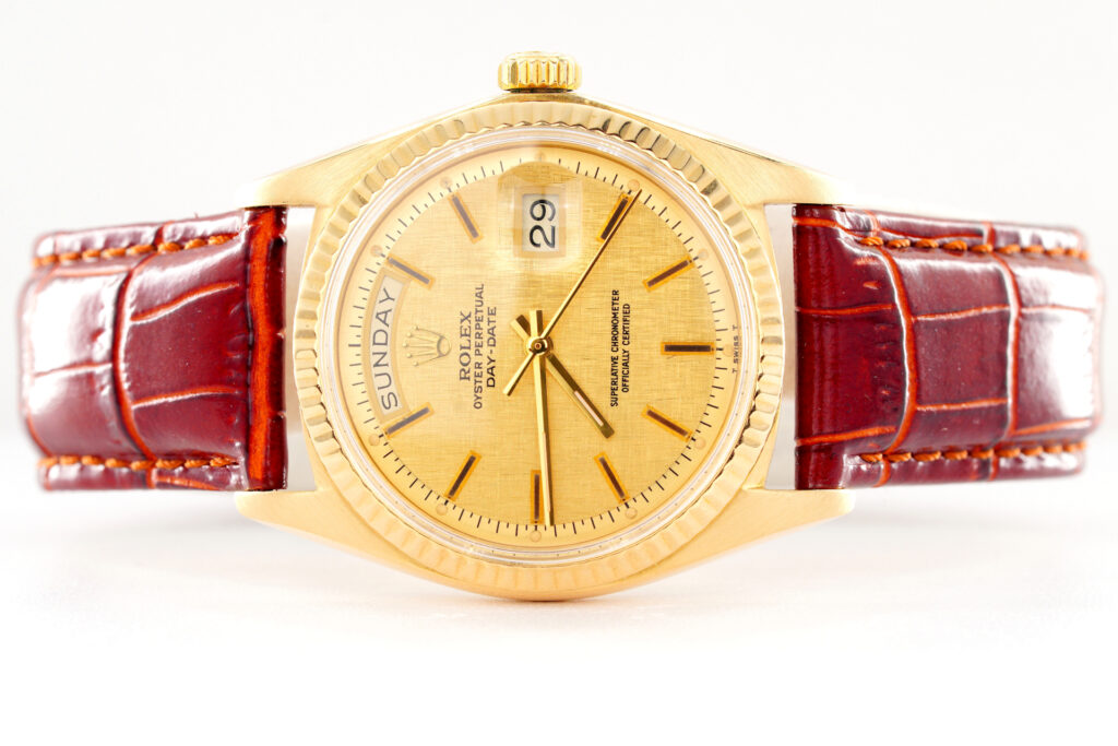 BeckerTime is proud to offer this Men’s 36mm Rolex Solid 18K Yellow Gold Day-Date Watch ref #1803 with a Gold Linen Dial. This Rolex has been fitted with an aftermarket Brown leather strap. This timepiece is in EXCELLENT CONDITION.