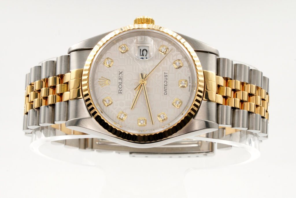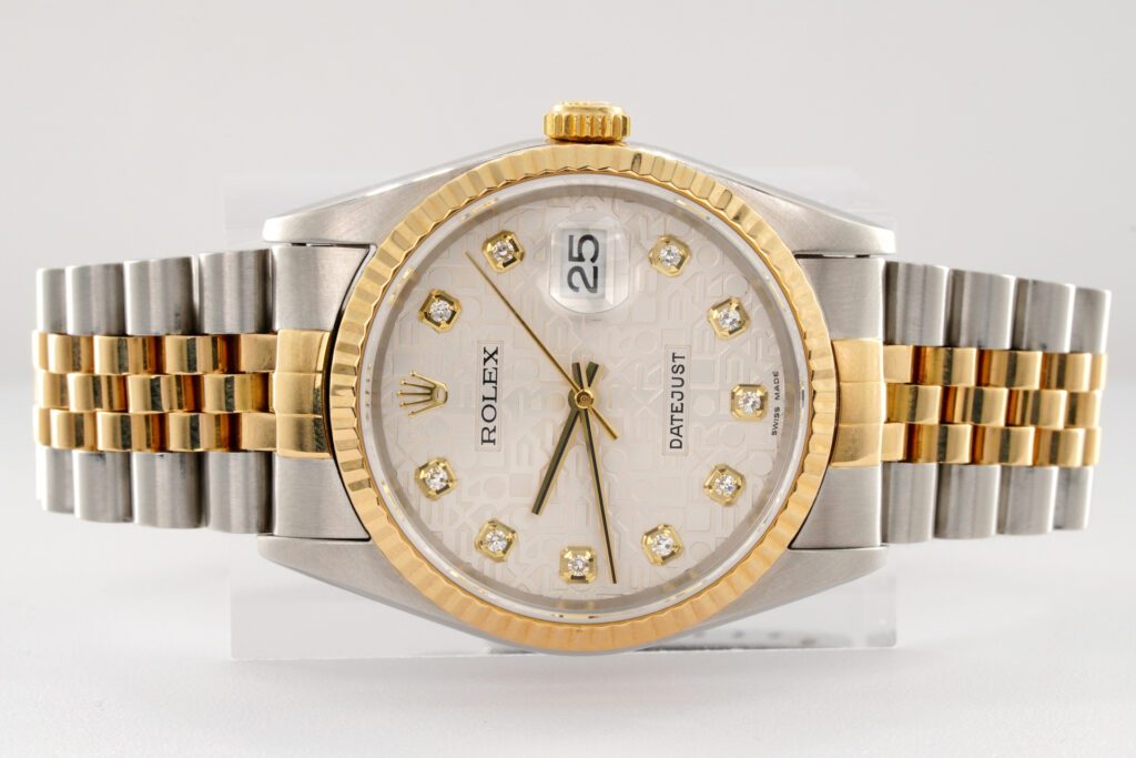 BeckerTime is proud to offer this handsome Men’s 36mm Rolex 2Tone 18K Yellow Gold & Stainless Steel Datejust Watch ref #16233 with a Rolex factory Silver Anniversary Diamond Dial. This is the desired “NO-HOLES” QUICKSET MODEL with the SAPPHIRE CRYSTAL and a Rolex Jubilee band. This Rolex is from the early to mid 2000’s and is in EXCELLENT CONDITION.