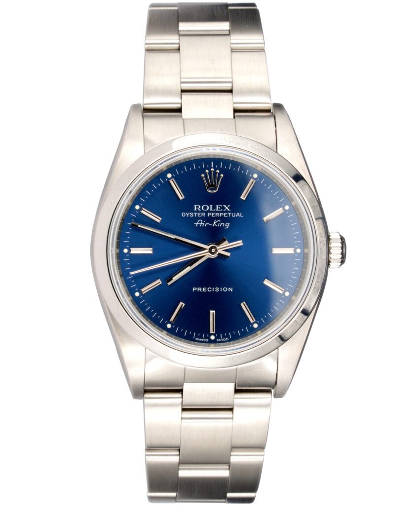 BeckerTime is proud to offer this very nice Men’s 34mm Rolex Stainless Steel Air-King Watch ref #14000M with a Blue dial. And it get’s better…This is the desired “NO HOLES” post-2000 model series with the SAPPHIRE CRYSTAL and a Rolex Oyster band. This Rolex is in SUPER EXCELLENT CONDITION.