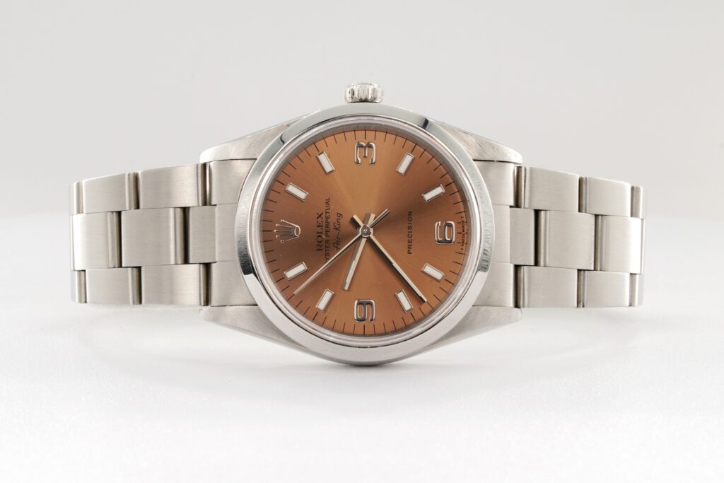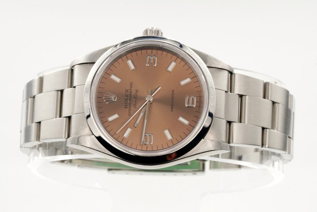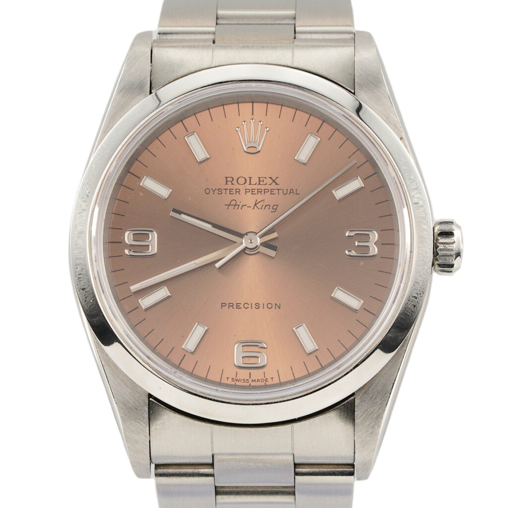 BeckerTime is proud to offer this super nice Men’s 34mm Rolex Stainless Steel Air-King Watch model ref #14000 with a Salmon Arabic dial. And it get’s better…It has a Rolex Oyster band a SAPPHIRE CRYSTAL and comes with the original ROLEX PAPERWORK. This Rolex is in SUPER EXCELLENT CONDITION.