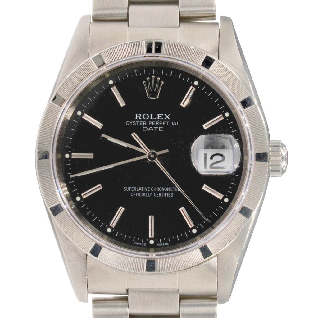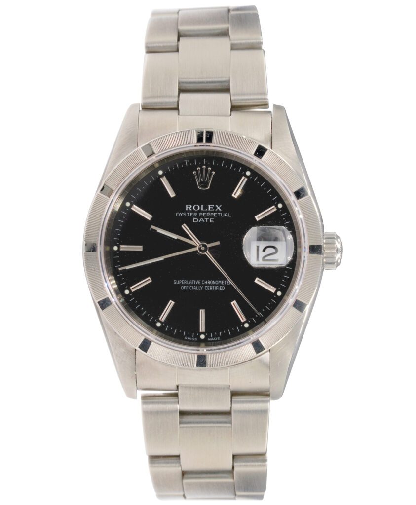 BeckerTime is proud to offer this stunning Men’s 34mm Rolex Stainless Steel Oyster Perpetual Date Watch ref #15210 with a Black Dial. This is the desired “NO HOLES” QUICKSET MODEL with a SAPPHIRE CRYSTAL and Rolex Oyster band. This Rolex is in SUPER EXCELLENT CONDITION.