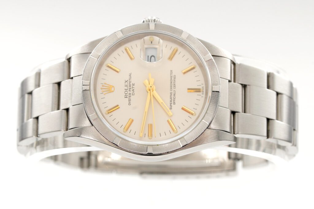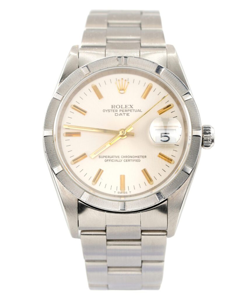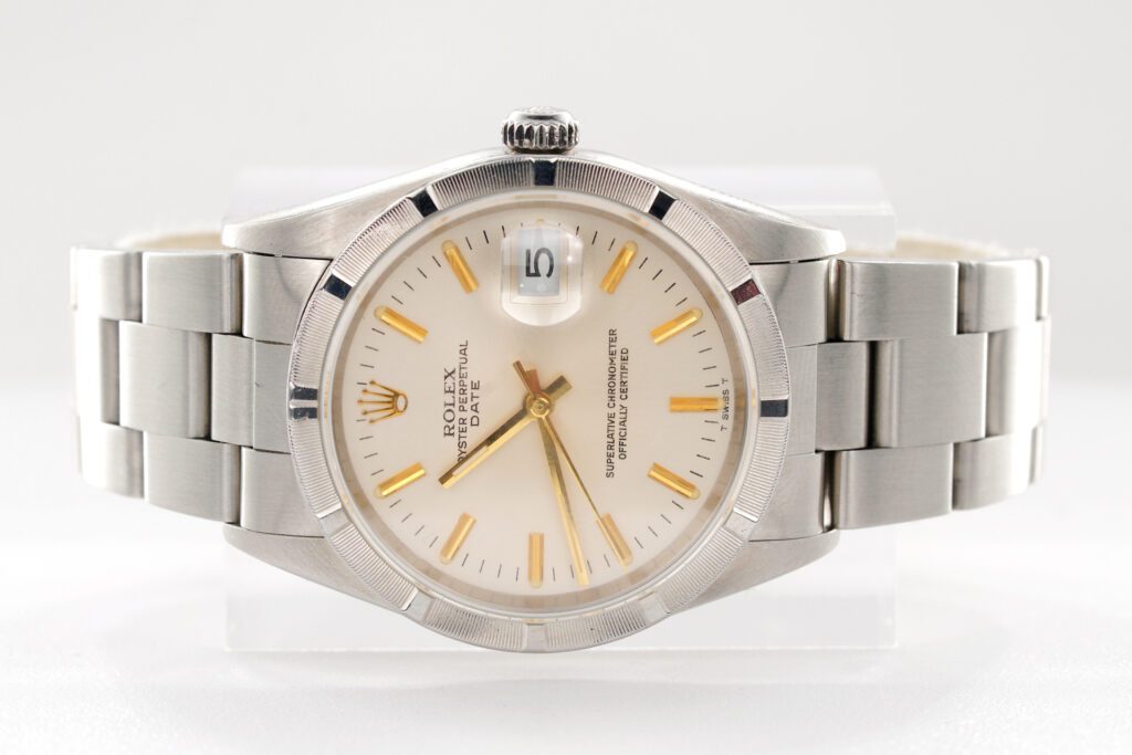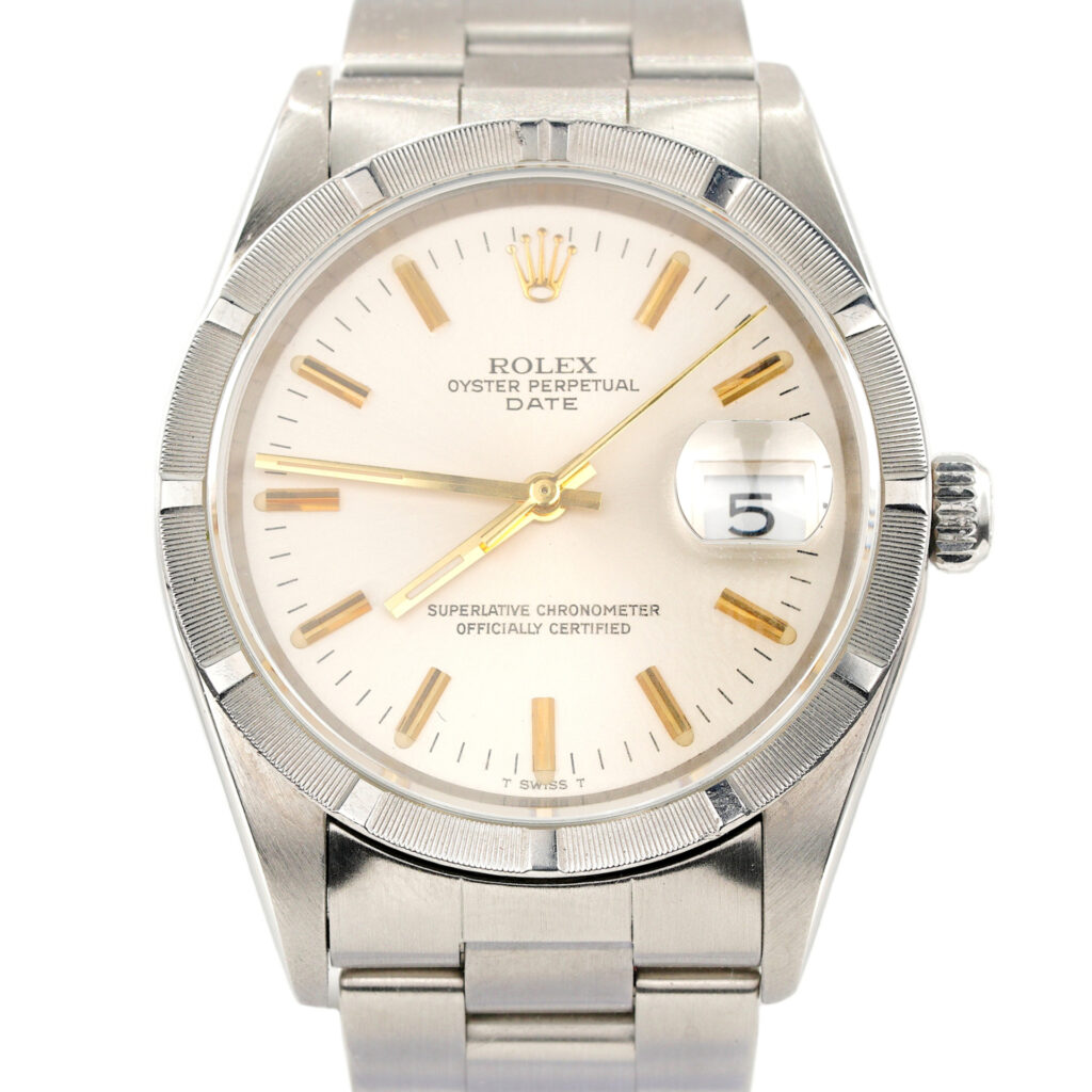 Dial Rolex SILVER dial with raised yellow gold stick markers. This is a “T Swiss T” dial from the 1980’s.