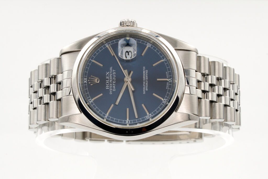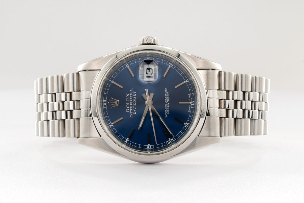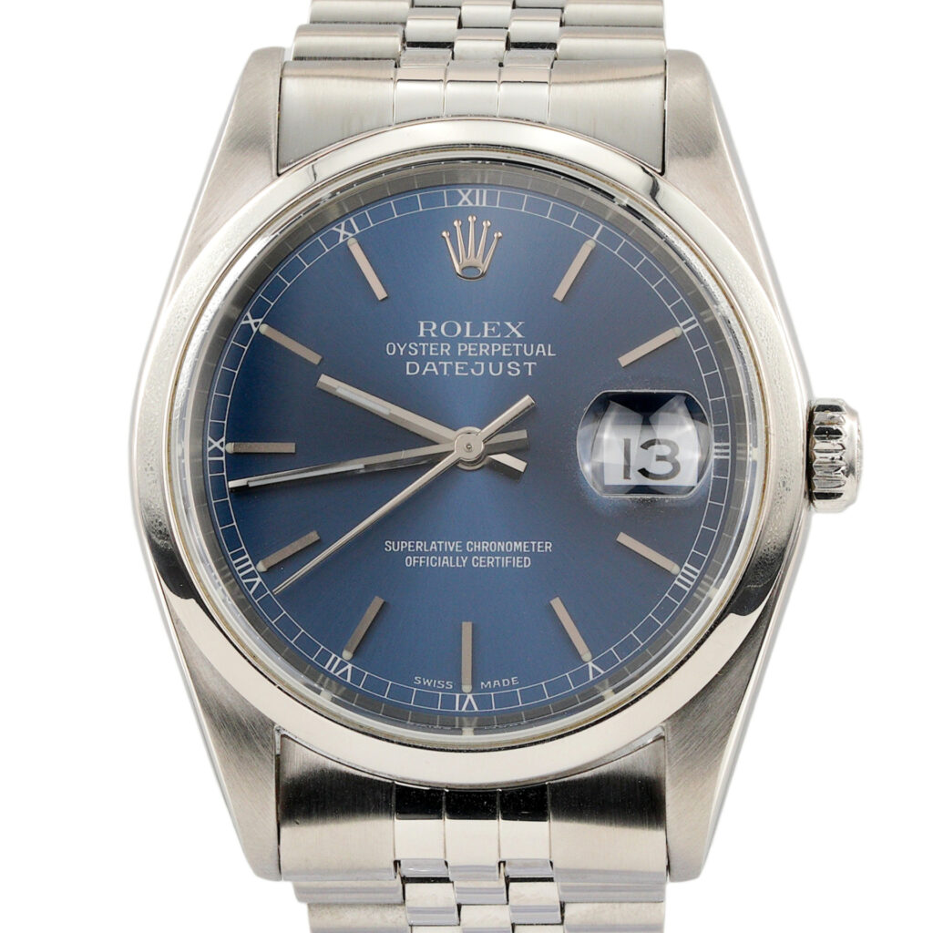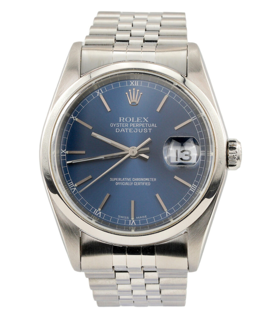 BeckerTime is proud to offer this handsome Men’s 36mm Rolex Stainless Steel Datejust Watch model ref #16200 with a Blue Dial. This is the desired “NO HOLES” QUICKSET MODEL with the SAPPHIRE CRYSTAL and a Rolex Jubilee band. This Rolex is in SUPER EXCELLENT CONDITION.