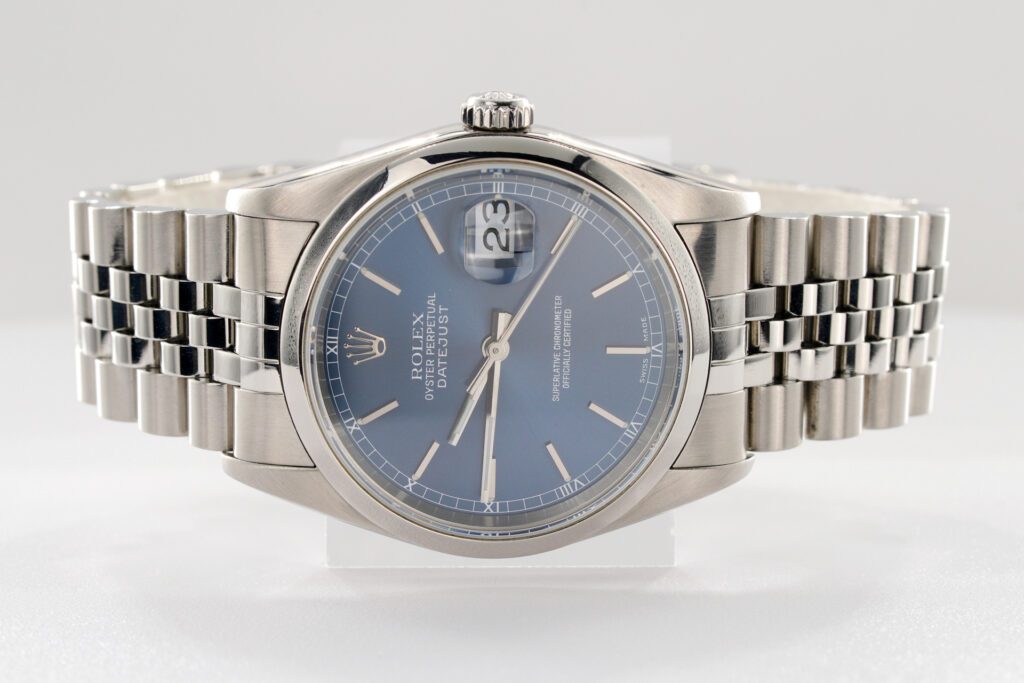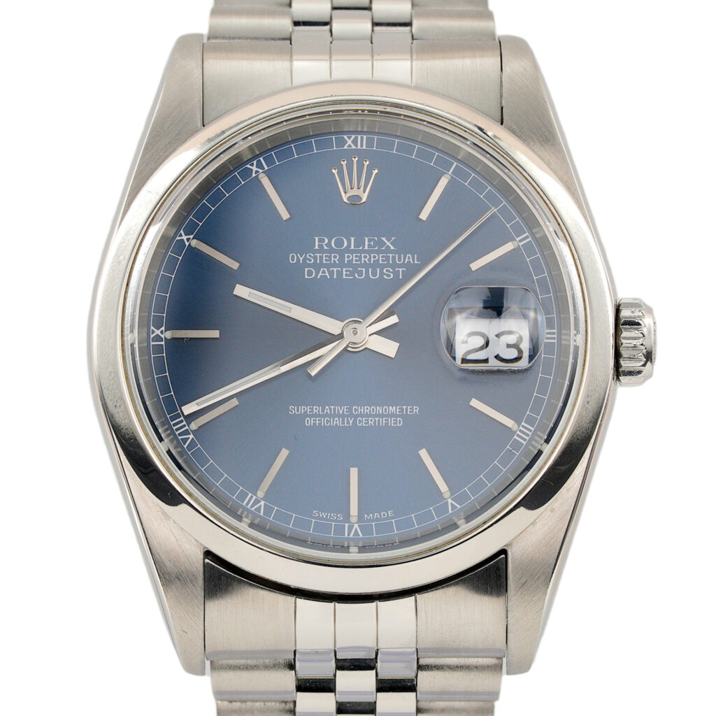 BeckerTime is proud to offer this handsome Men’s 36mm Rolex Stainless Steel Datejust Watch model ref #16200 with a Blue Dial. This is the desired “NO HOLES” QUICKSET MODEL with the SAPPHIRE CRYSTAL and a Rolex Jubilee band. This Rolex is in SUPER EXCELLENT CONDITION.