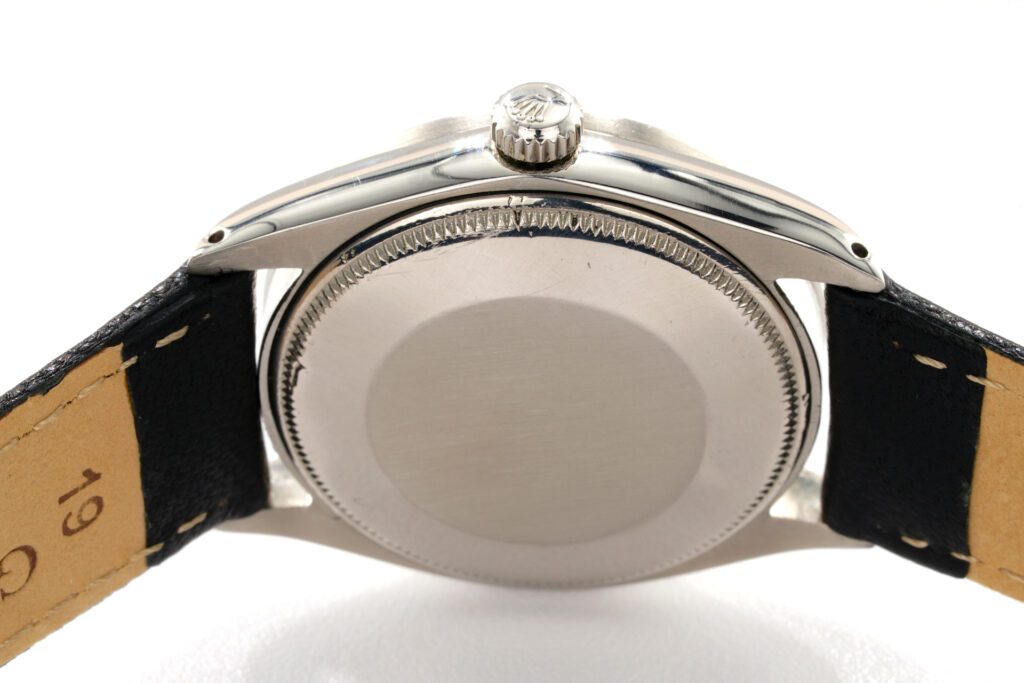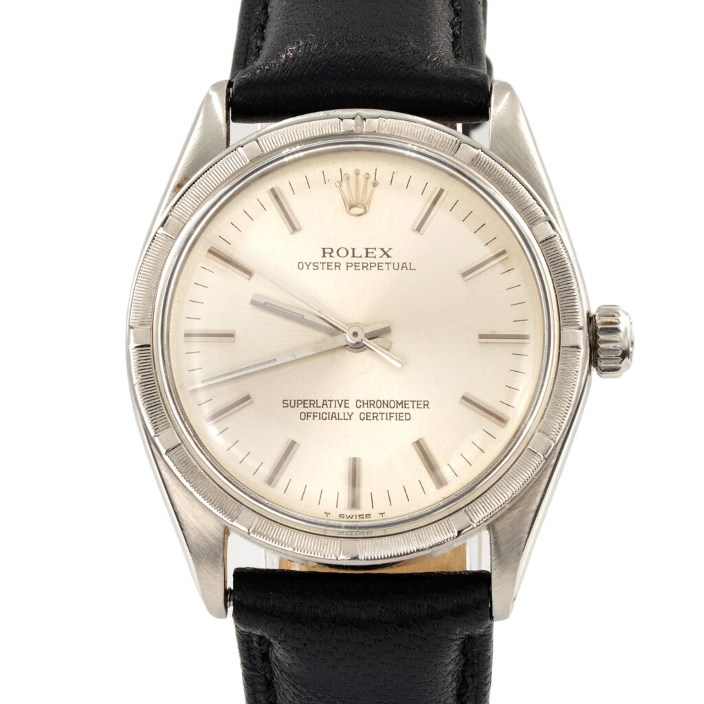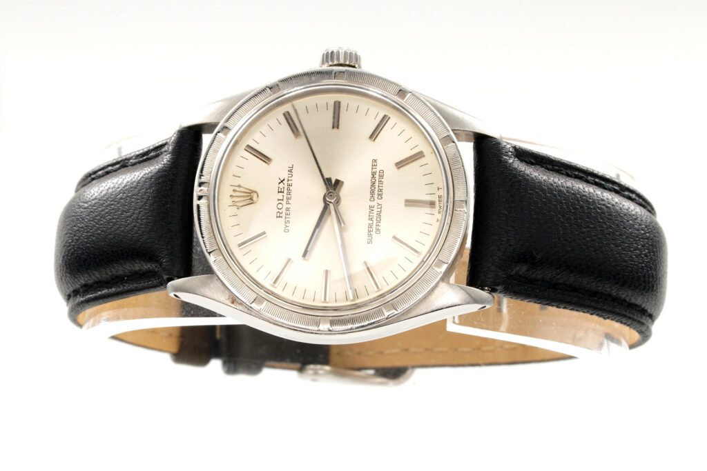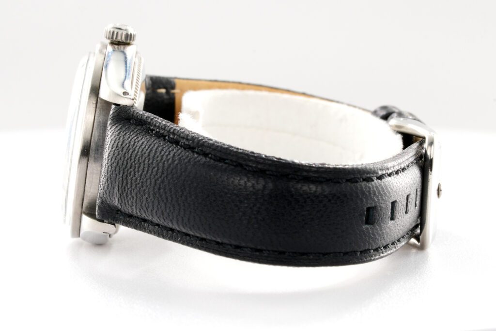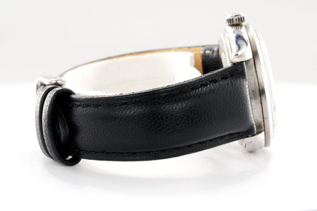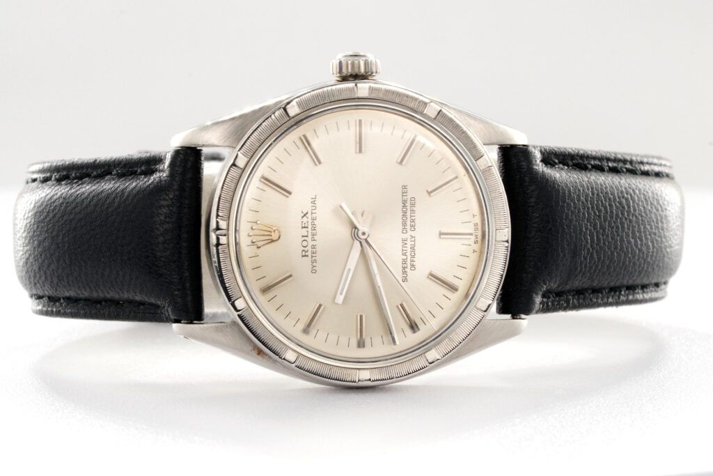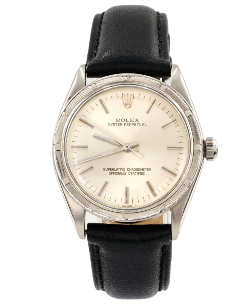 BeckerTime is proud to offer this stunning vintage Men’s 34mm Rolex Stainless Steel Oyster Perpetual Watch ref #1007 with Silver Dial and custom aftermarket Black leather strap. This Rolex is in EXCELLENT CONDITION.