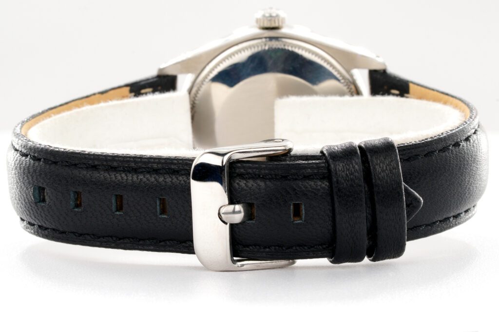 Band BLACK leather strap with plain steel buckle. This strap is not made by Rolex. It is a custom aftermarket band.