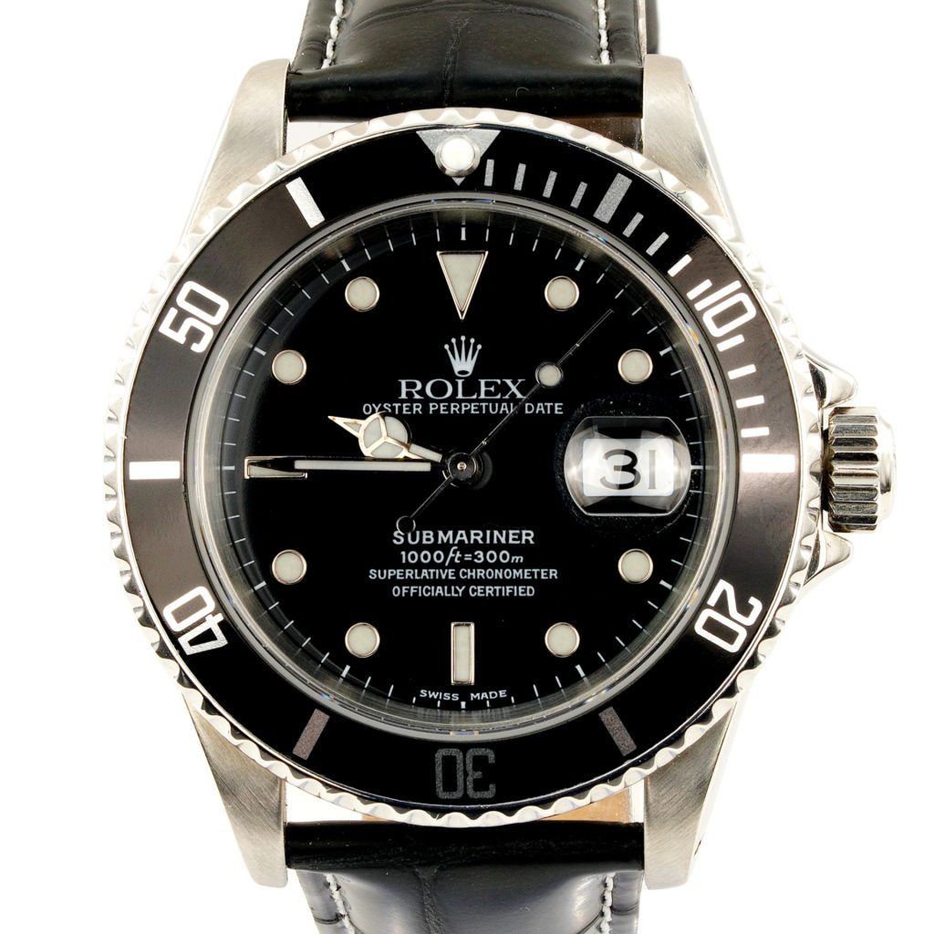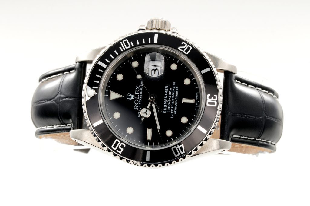 BeckerTime is proud to offer this handsome Men’s 40mm Rolex Stainless Steel Submariner Date Watch with Black Dial & Bezel ref #16610. This Rolex has been fitted with an aftermarket Black leather band and is in SUPER EXCELLENT CONDITION.