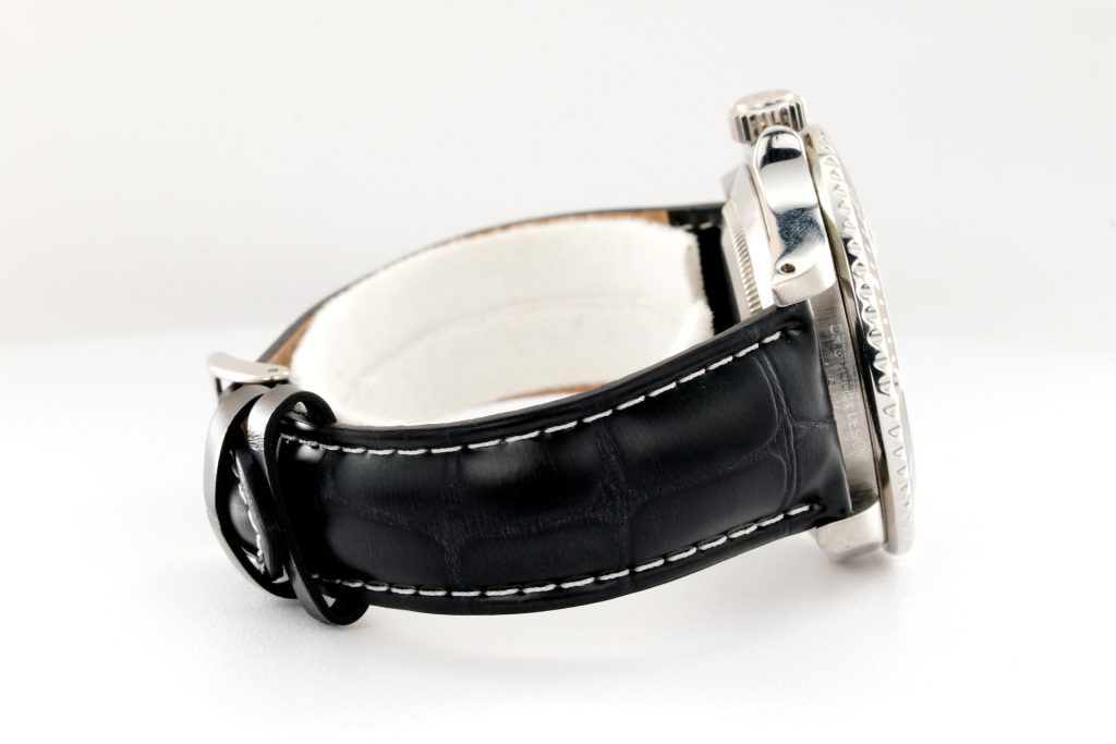 Band BLACK leather strap with plain stainless steel buckle. This band is not made by Rolex as it is a custom aftermarket band.