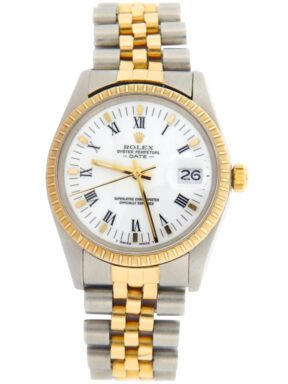 BeckerTime is proud to offer this stunning vintage Mens 34mm Rolex 2tone 18K Yellow Gold and Stainless Steel Watch model ref #15053 with a White Roman Dial. And it get’s better…This Rolex is the desired QUICKSET model and has a Rolex Jubilee band. It is in EXCELLENT CONDITION.