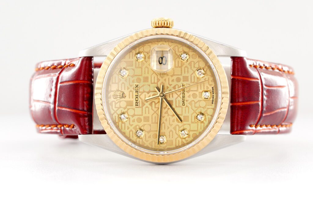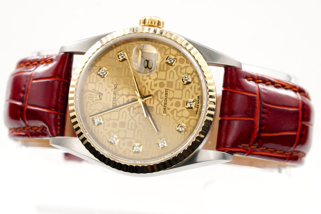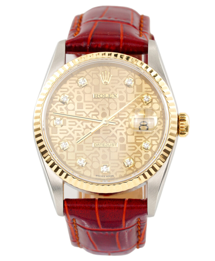 BeckerTime is proud to offer this very nice Men’s 36mm Rolex 2Tone 18K Yellow Gold and Stainless Steel Datejust Watch reference #16233 with a Gold “Anniversary” Diamond Dial. It has been fitted with a Brown leather strap. This is the desired QUICKSET MODEL with the SAPPHIRE CRYSTAL.This Rolex is in SUPER EXCELLENT CONDITION.