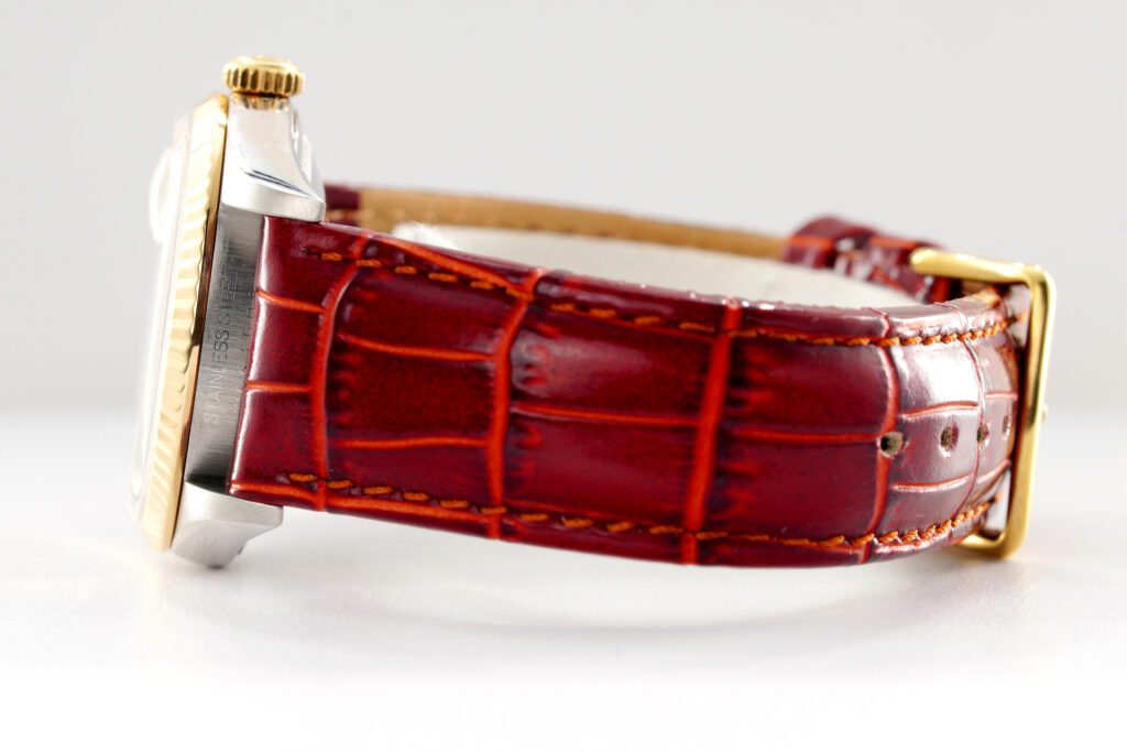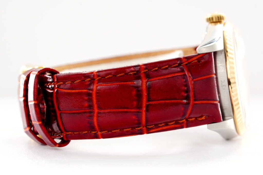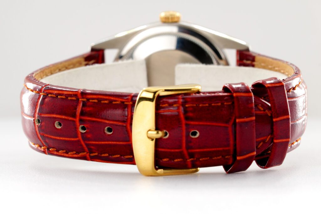 Band BROWN leather strap with plain gold tone buckle. This strap is not made by Rolex as it is a custom made aftermarket band.