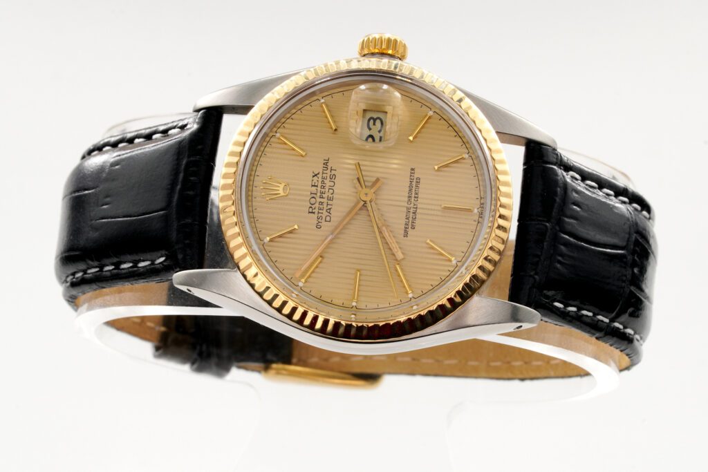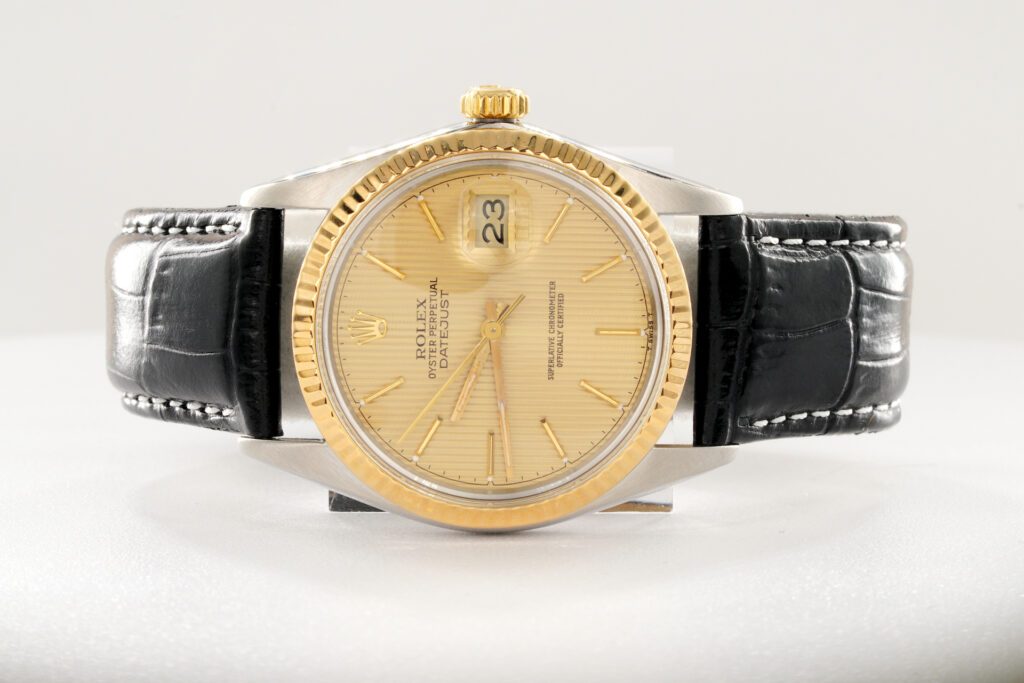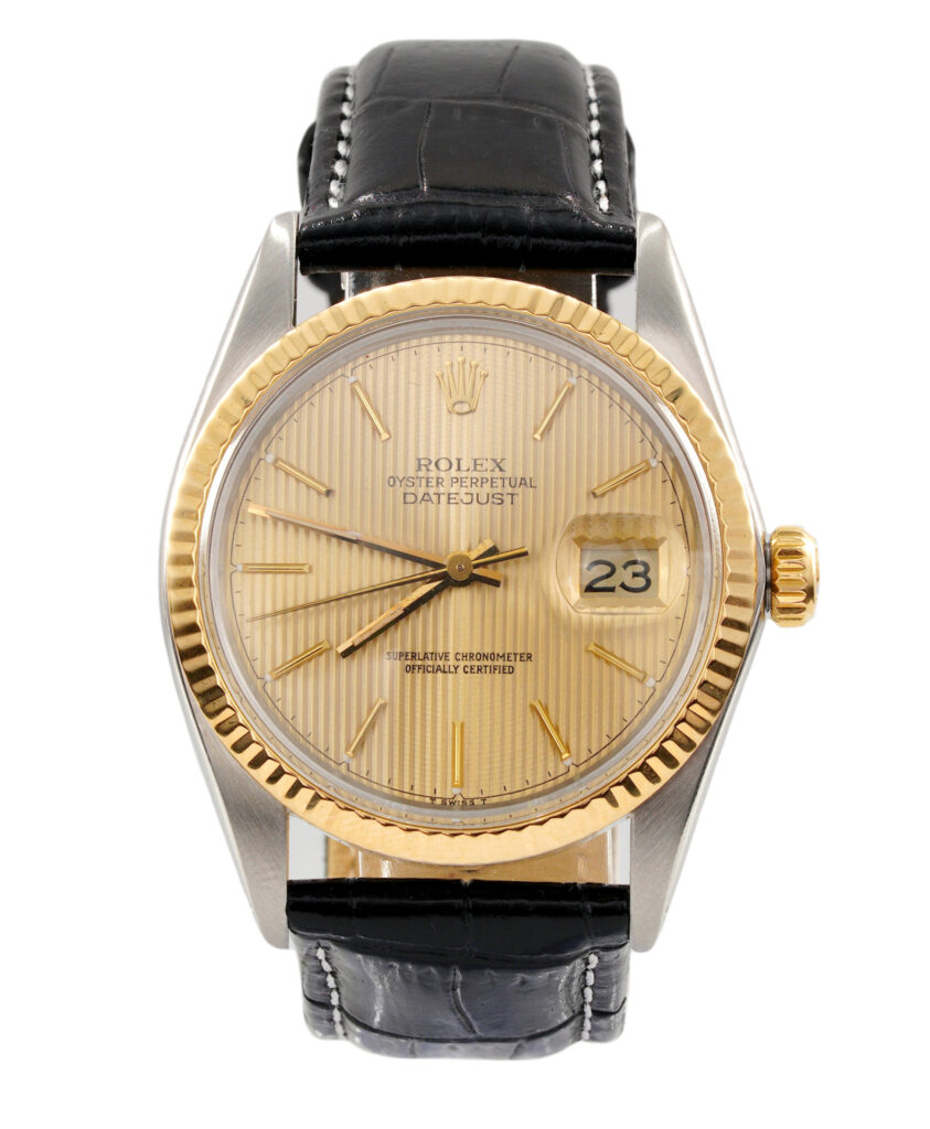 BeckerTime is proud to offer this handsome Men’s 36mm Rolex2tone 18k Yellow Gold & Stainless Steel Datejust Watch ref #16013 with a Gold Tapestry Dial that is guaranteed to impress! This Rolex has been fitted with an aftermarket Black leather band. This is the QUICKSET MODEL and  is in EXCELLENT CONDITION.