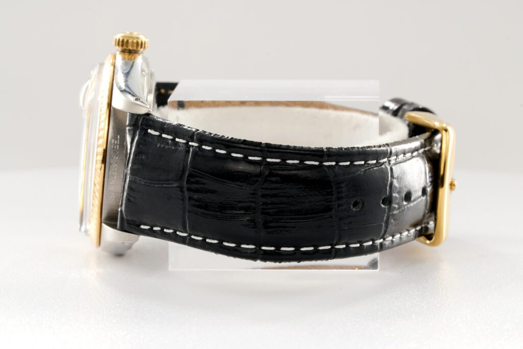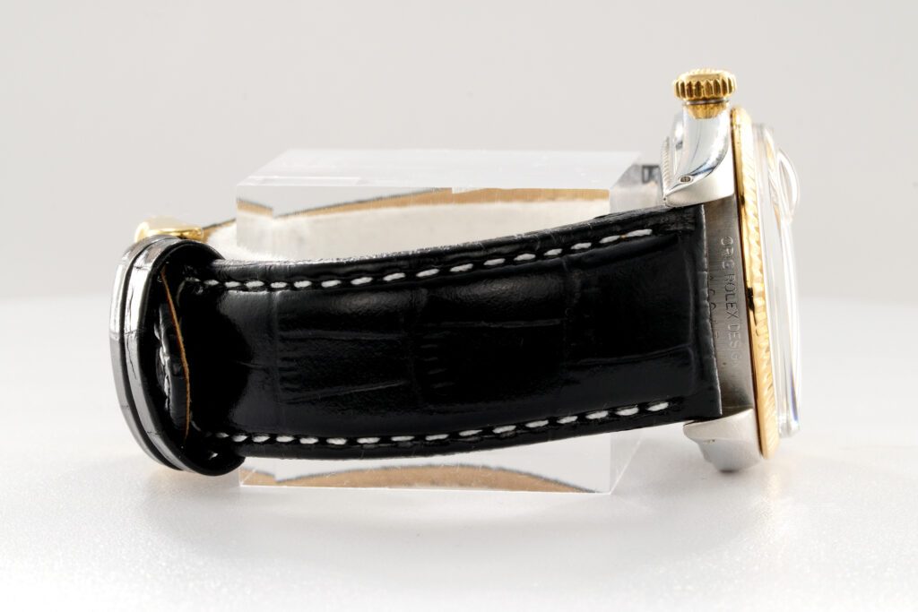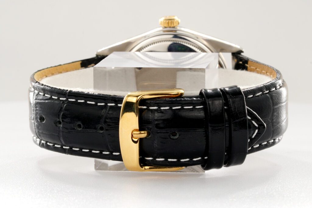 Band BLACK leather strap with plain steel gold-tone buckle. This strap is not made by Rolex. It is a custom aftermarket leather strap