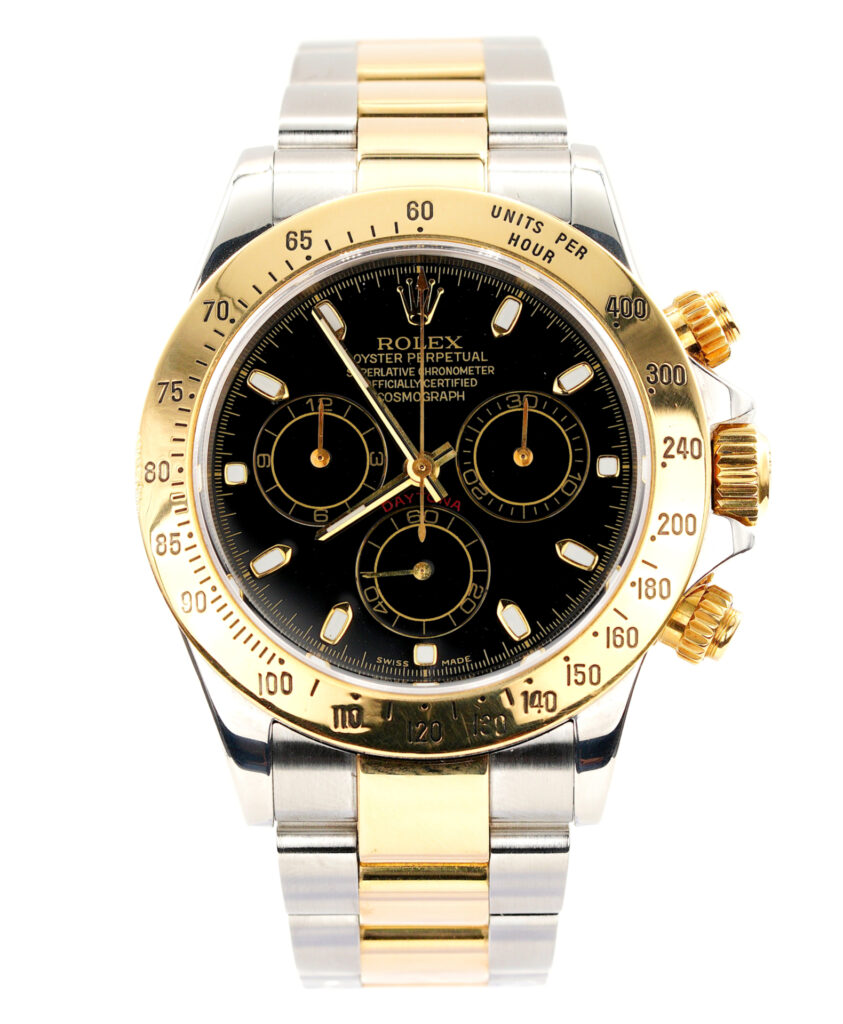 BeckerTime is proud to offer this very nice Men’s 40mm Rolex 2Tone 18K Yellow Gold & Stainless Steel Daytona Watch ref #116523 with a Black Dial. It is from the early 2000’s and has the desired SEL Oyster band. This Rolex is in EXCELLENT CONDITION.