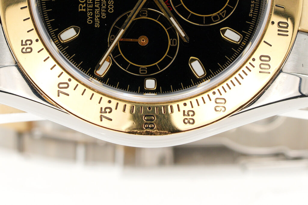 | Bezel | Rolex solid 18k yellow gold bezel with an Engraved Tachymetric Scale. Bezel has been damaged on the 9 o’clock side. Please see pictures |