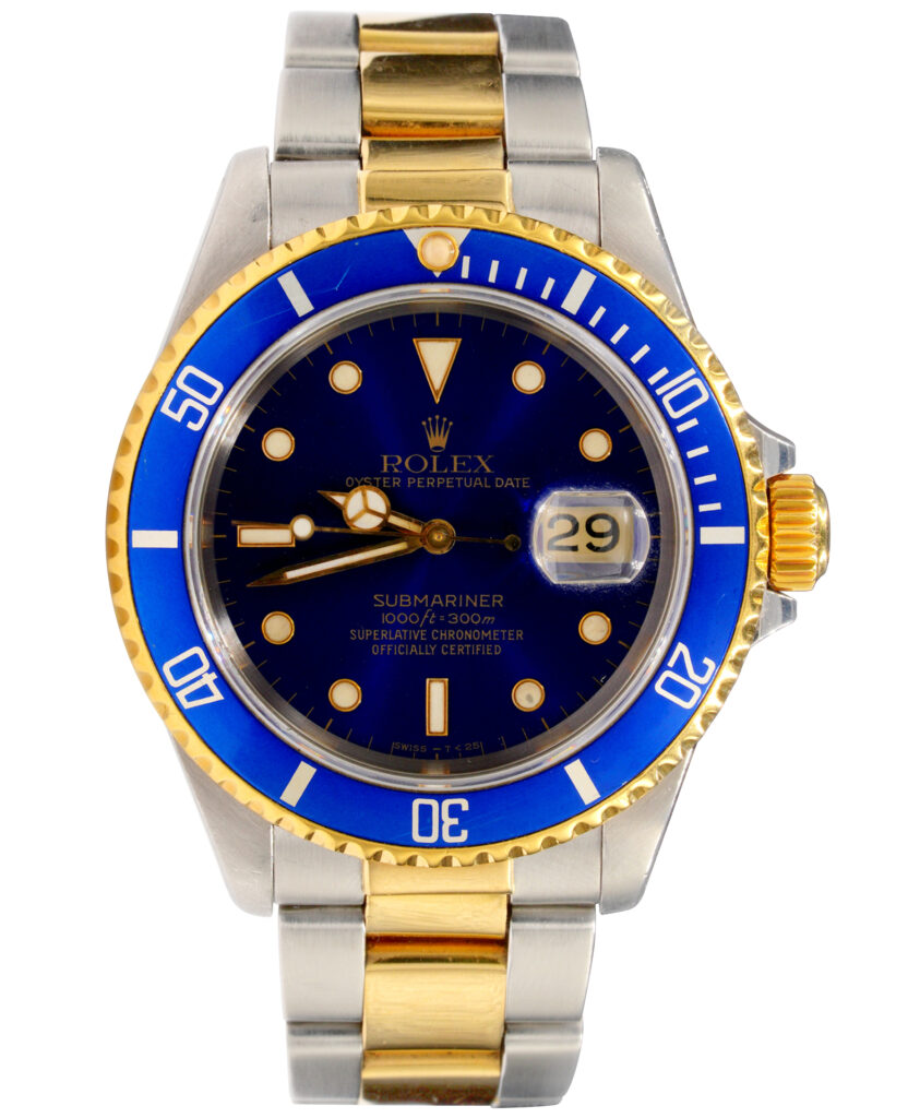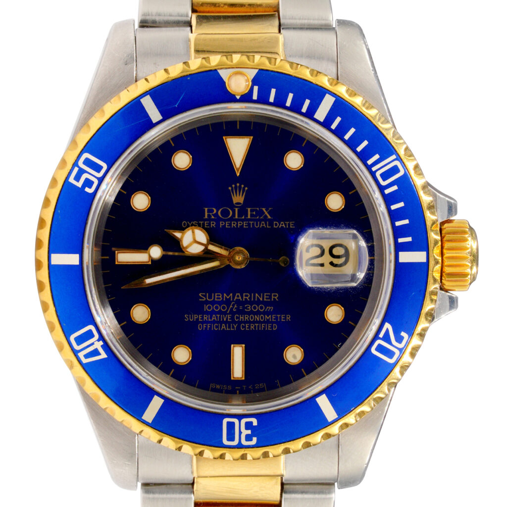 BeckerTime is proud to offer this handsome Mens 40mm Rolex Two-Tone 18k Yellow Gold & Stainless Steel Submariner Watch ref #16613 with a Blue Dial and Bezel. This Rolex is in EXCELLENT CONDITION.