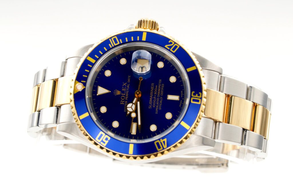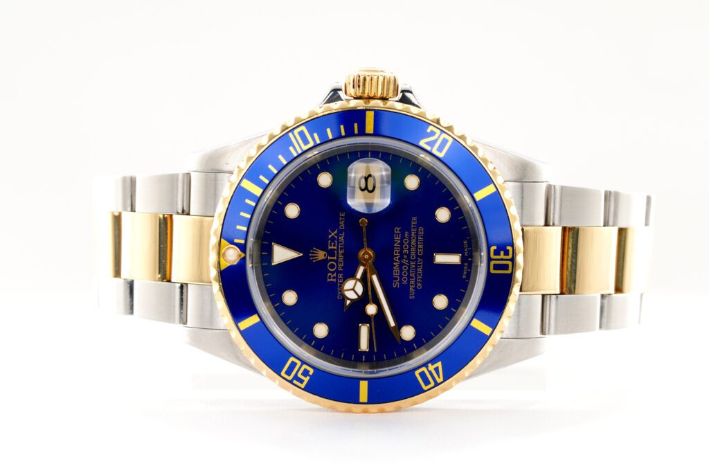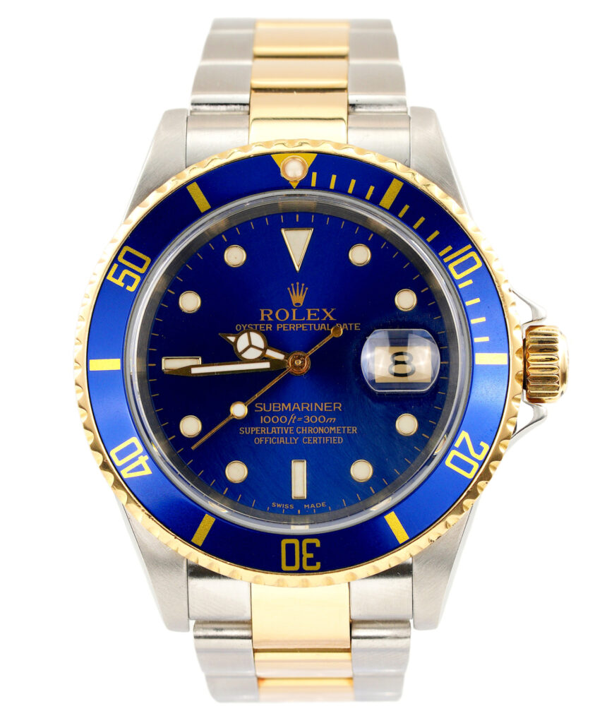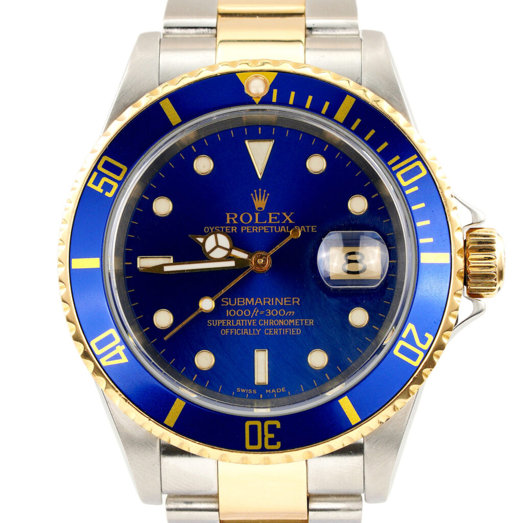 BeckerTime is proud to offer this handsome Mens 40mm Rolex Two-Tone 18k Yellow Gold & Stainless Steel Submariner Watch ref #16613T with a Blue Dial and Bezel. This is a “NO HOLES” Model with the desired Solid End Link (SEL) Oyster band with “GOLD THROUGH” CLASP. This Rolex is in SUPER EXCELLENT CONDITION.