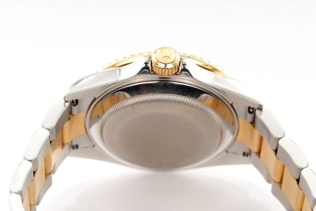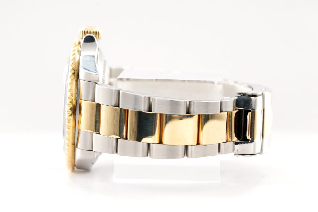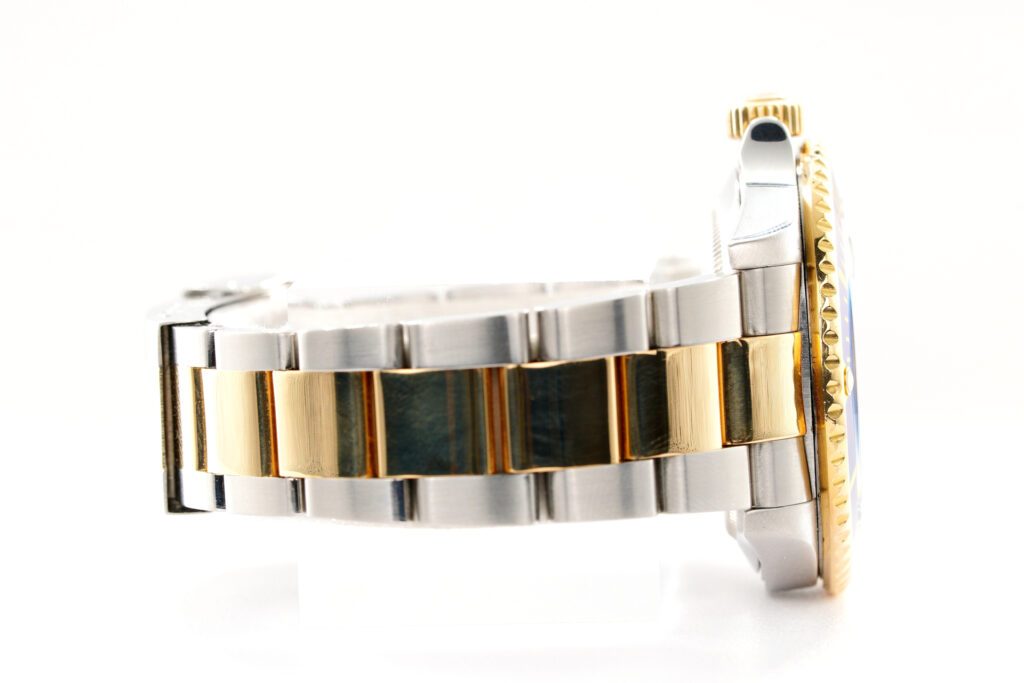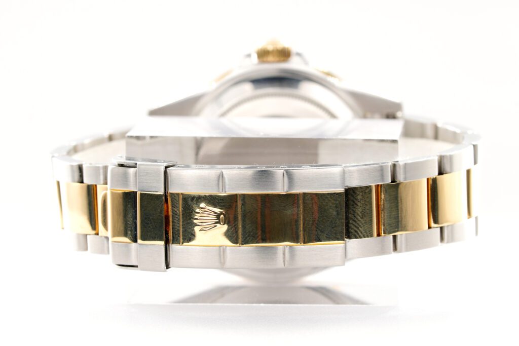 | Band | Rolex 2tone 18k yellow gold and stainless steel Oyster bracelet with Rolex signed flip-lock clasp and special divers extension. THIS IS THE DESIRED (SOLID END LINK) SEL BAND WITH THE GOLD THROUGH CLASP. Band has Stretch and Wear. |