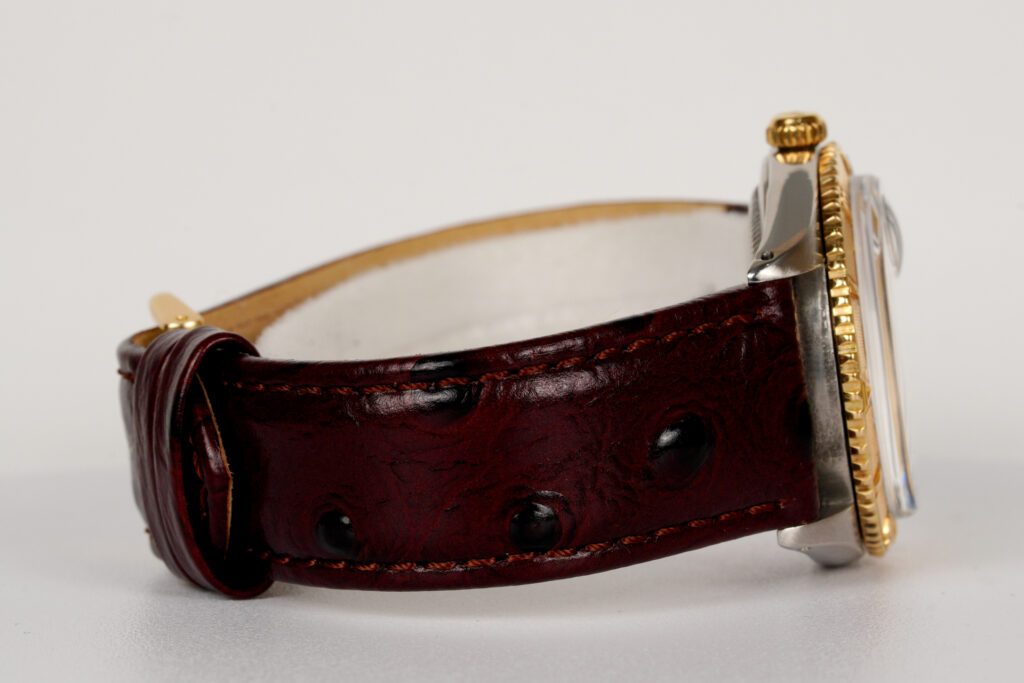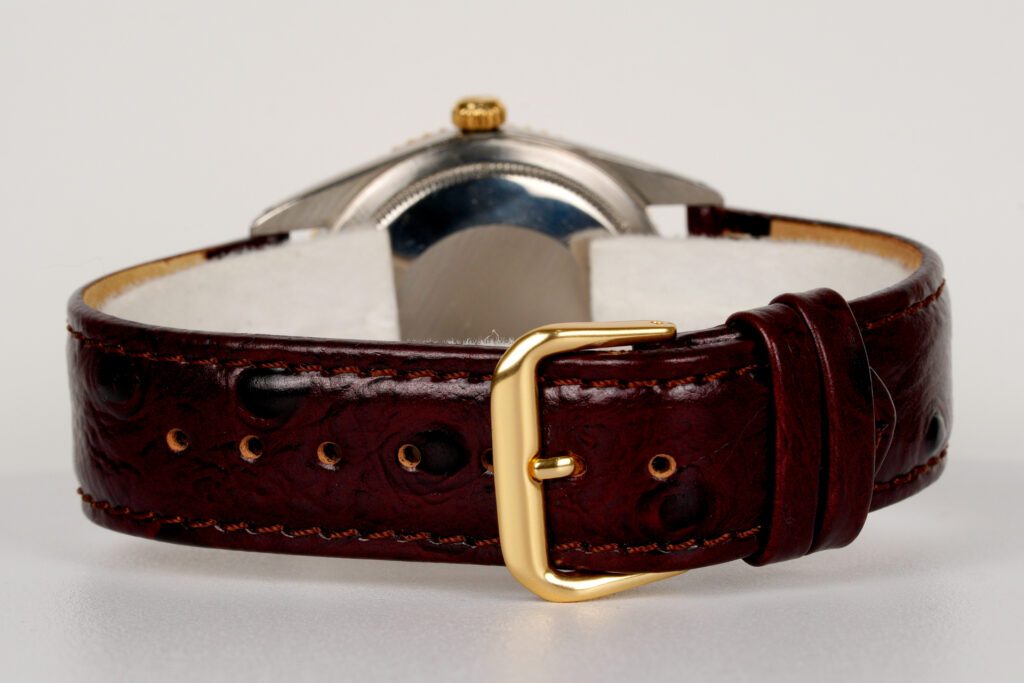 | Band | BROWN leather strap with plain gold-tone stainless steel buckle. This strap is not made by Rolex as it is a custom made aftermarket band |
