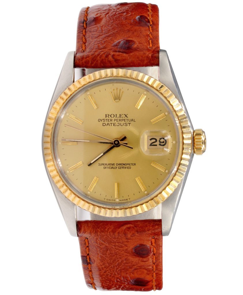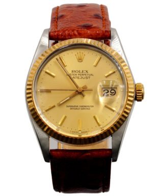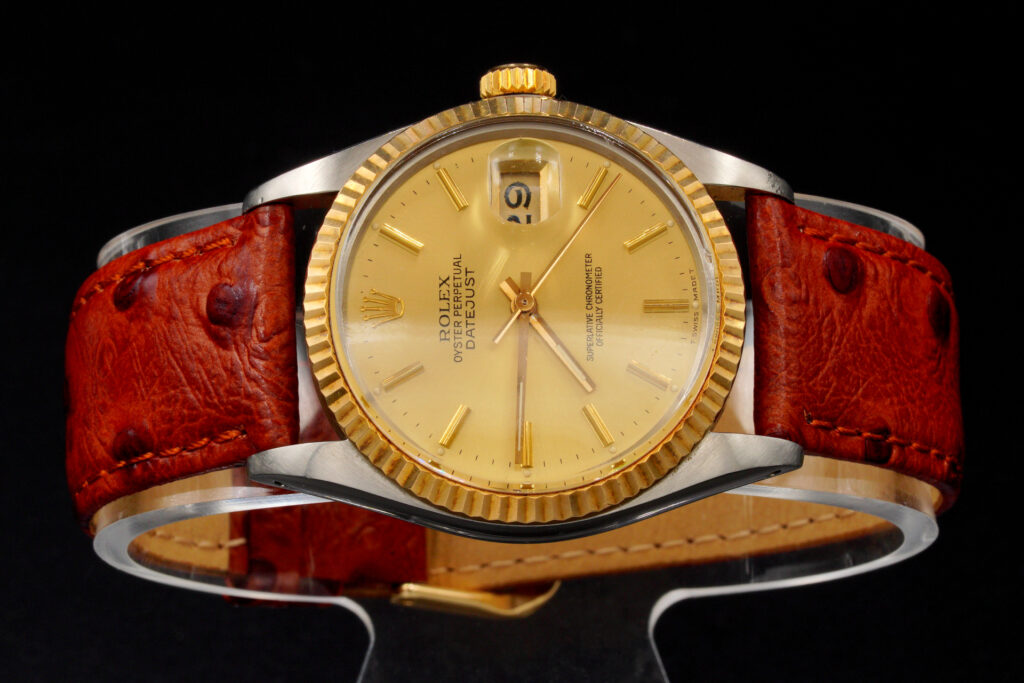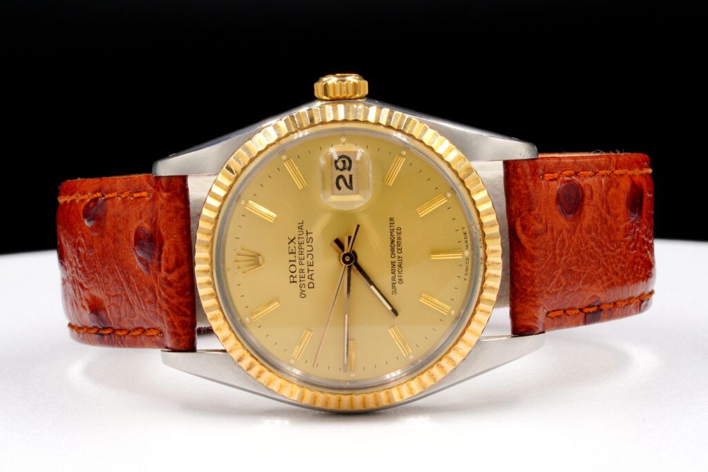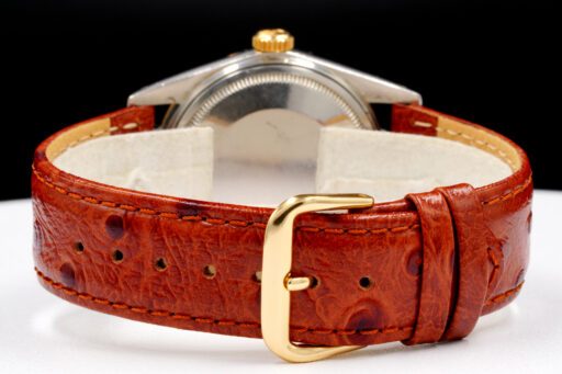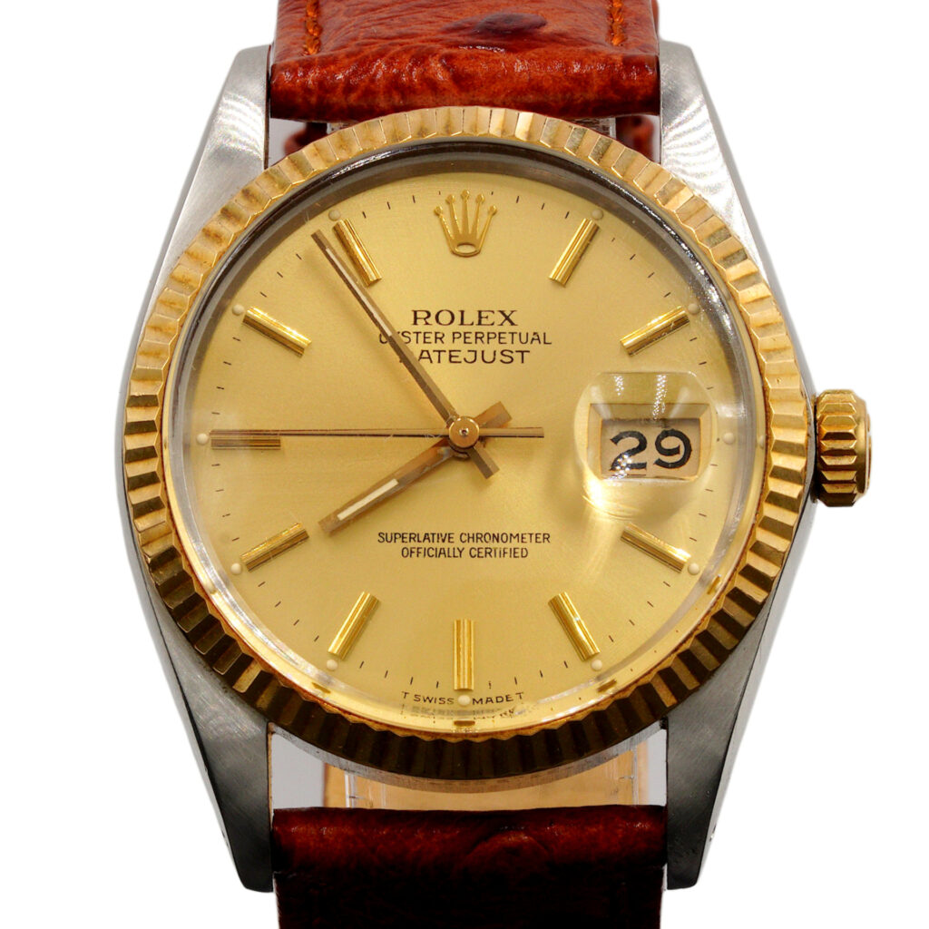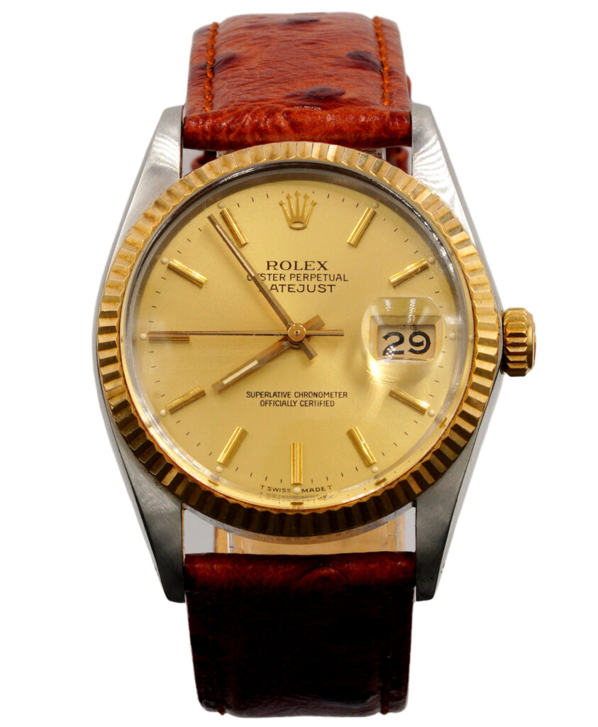 BeckerTime is proud to offer this handsome Men’s 36mm Rolex 2Tone 18K Yellow Gold & Stainless Steel Datejust Watch model ref #16013 with a Gold Champagne Dial. It has been fitted with a custom aftermarket Brown leather strap. This is the desired QUICKSET MODEL. This Rolex is in SUPER EXCELLENT CONDITION.
