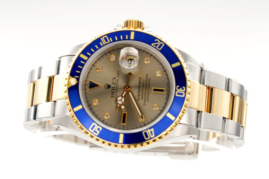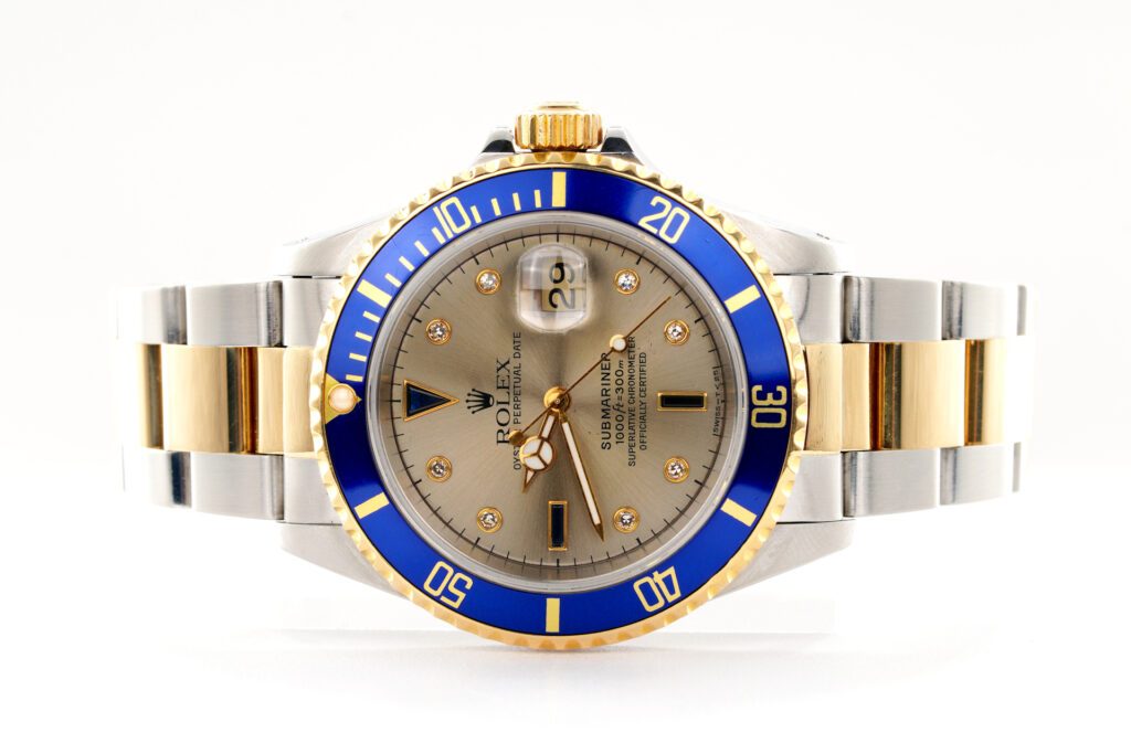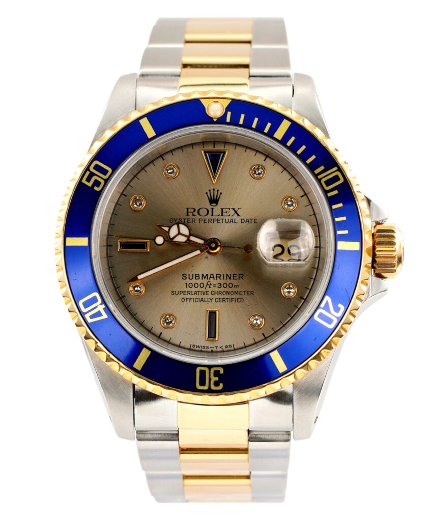 BeckerTime is proud to offer this impressive Men’s 40mm Rolex 2tone 18k Yellow Gold & Stainless Steel Submariner Date Watch ref #16613 with factory Rolex Slate Gray Diamond & Blue Sapphire Serti Dial. This Rolex is in SUPER EXCELLENT CONDITION.