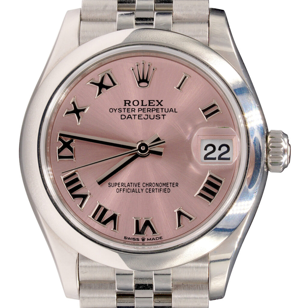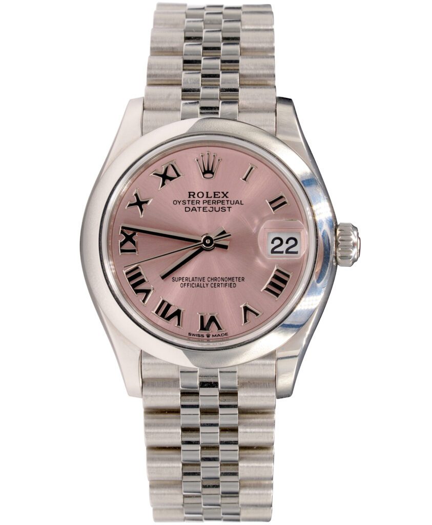 BeckerTime is proud to offer this stunning Midsize 31mm RolexStainless Steel Datejust Watch model ref #278240 with an Salmon Roman Dial. And it get’s better…This Rolex is the desired QUICKSET MODEL with a Rolex Jubilee band. This Rolex is in SUPER EXCELLENT CONDITION.