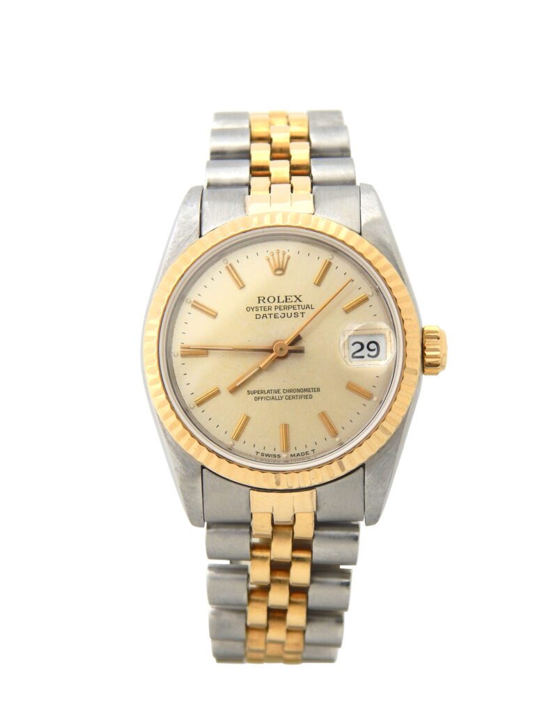 BeckerTime is proud to offer this Ladies Midsize 31mm 2Tone 18K Yellow Gold & Stainless Steel Rolex Datejust Watch model ref #68273 with a Fluted Bezel and Silver Dial. This is the desired QUICKSET MODEL with a SAPPHIRE CRYSTAL and a Rolex Jubilee band.