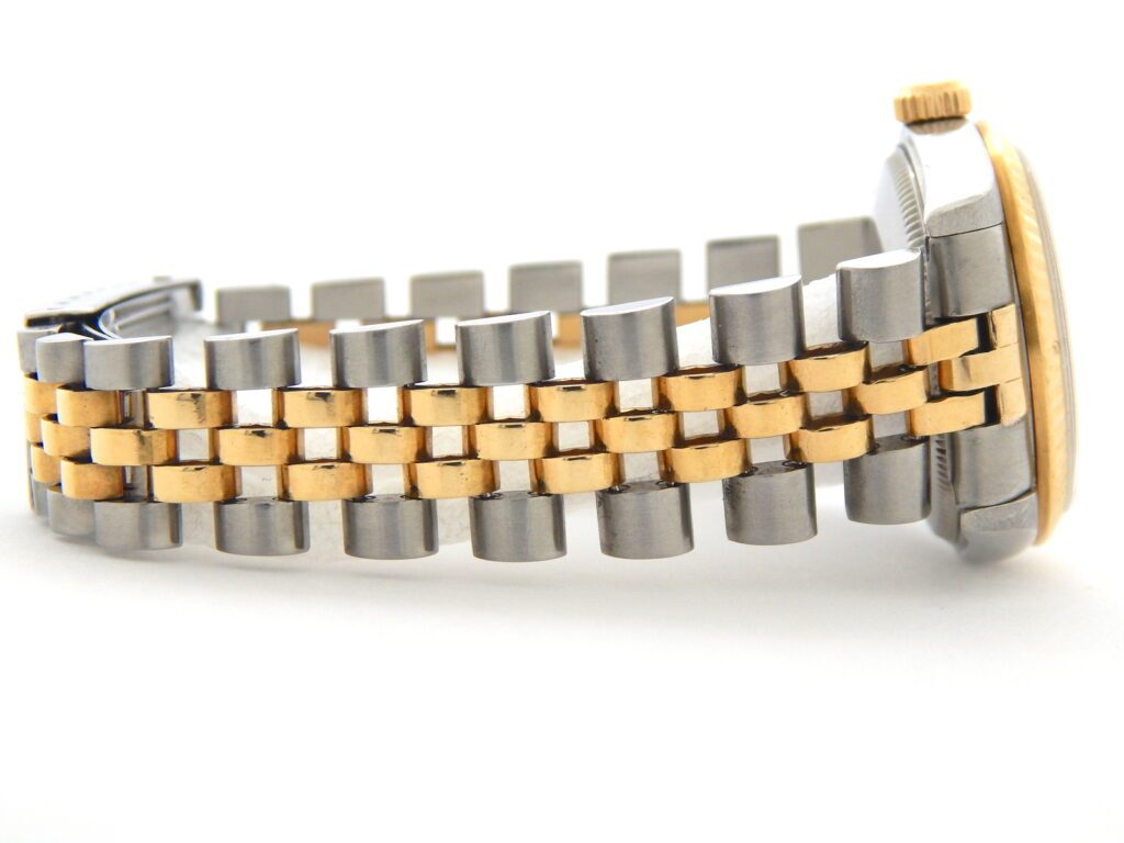 | Band | Rolex two-tone 18k yellow gold and stainless steel Jubilee bracelet with Rolex signed clasp. Very very loose stretch and wear. The end-pieces are aftermarket. |