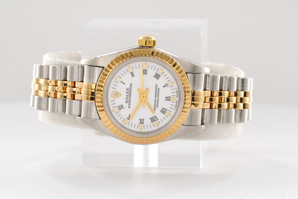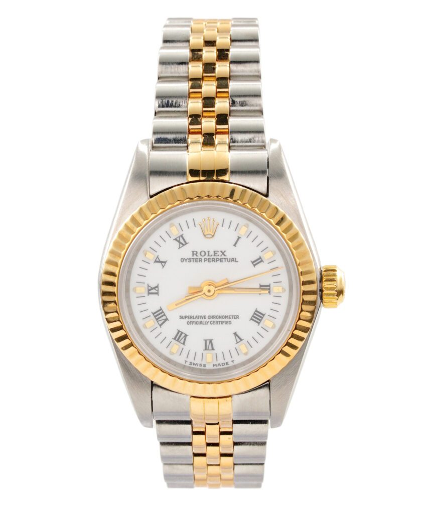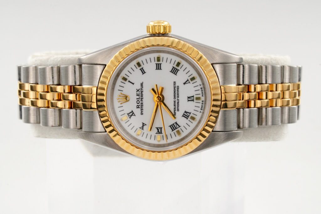 BeckerTime is proud to offer this beautiful Rolex timepiece. It is a Ladies 2tone 18k Gold and stainless steel Rolex Oyster Perpetual model ref #76193 with a white Roman dial. This Rolex is in SUPER EXCELLENT CONDITION.