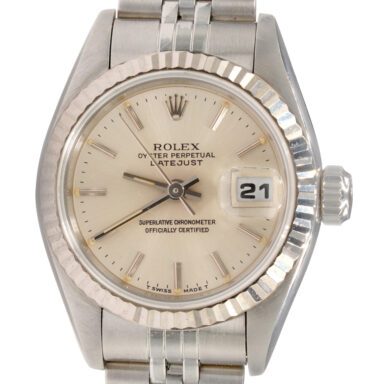 BeckerTime is proud to offer this super nice Ladies 26mm Rolex Stainless Steel/18K White Gold Datejust Watch model ref #69174 with a Silver Dial. And it get’s better…This is the desired QUICKSET MODEL with the SAPPHIRE CRYSTAL and a Rolex Jubilee band. This Rolex is from the mid 1990’s and is in SUPER EXCELLENT CONDITION.