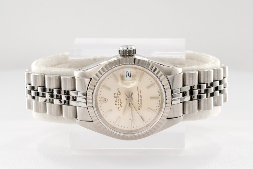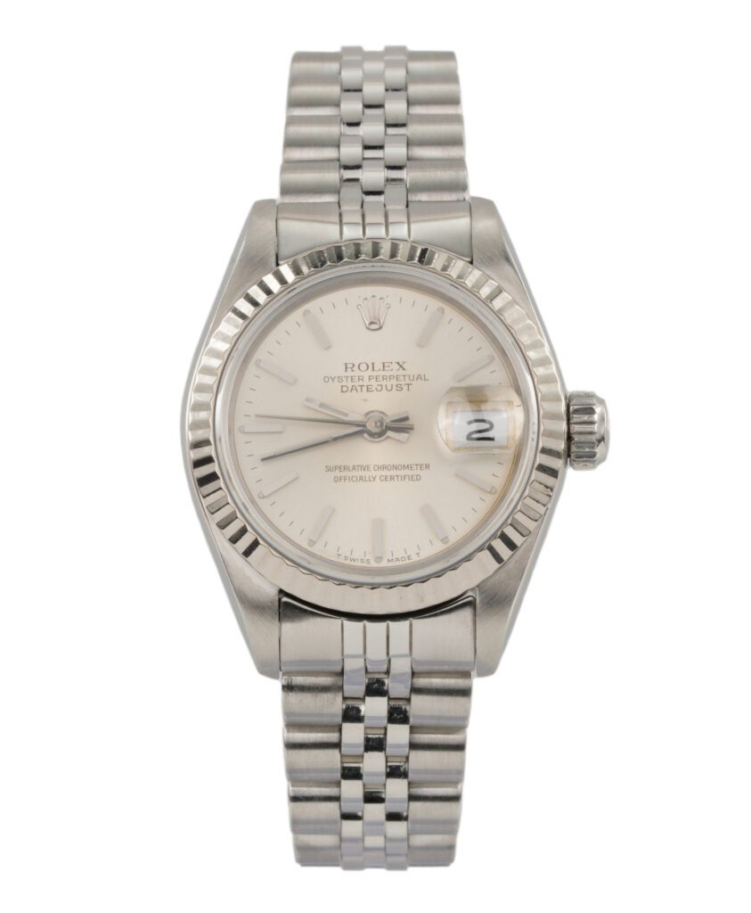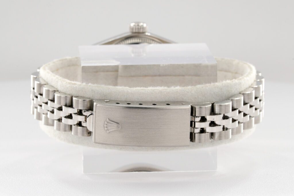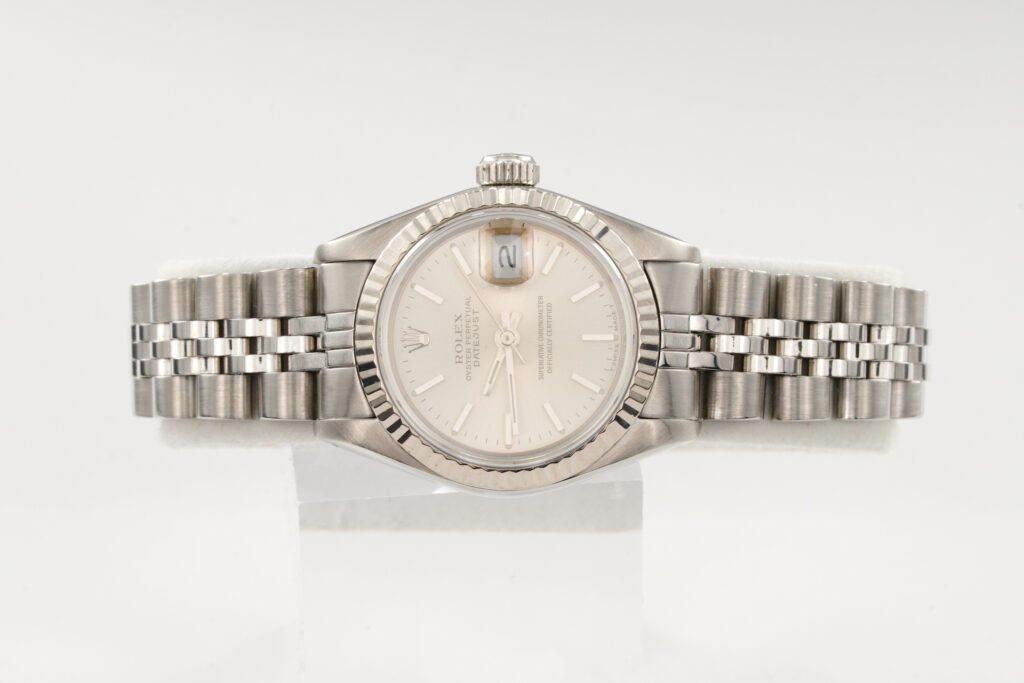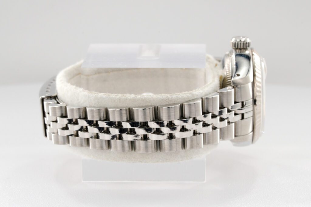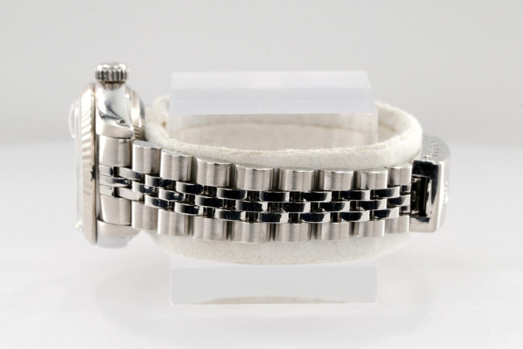 BeckerTime is proud to offer this super nice Ladies 26mm Stainless Steel Rolex Datejust Watch model ref #69174 with a Silver Dial and White Gold Fluted Bezel. And it get’s better…This is the desired QUICKSET MODEL with the SAPPHIRE CRYSTAL and a Rolex Jubilee band. This timepiece is in SUPER EXCELLENT CONDITION.