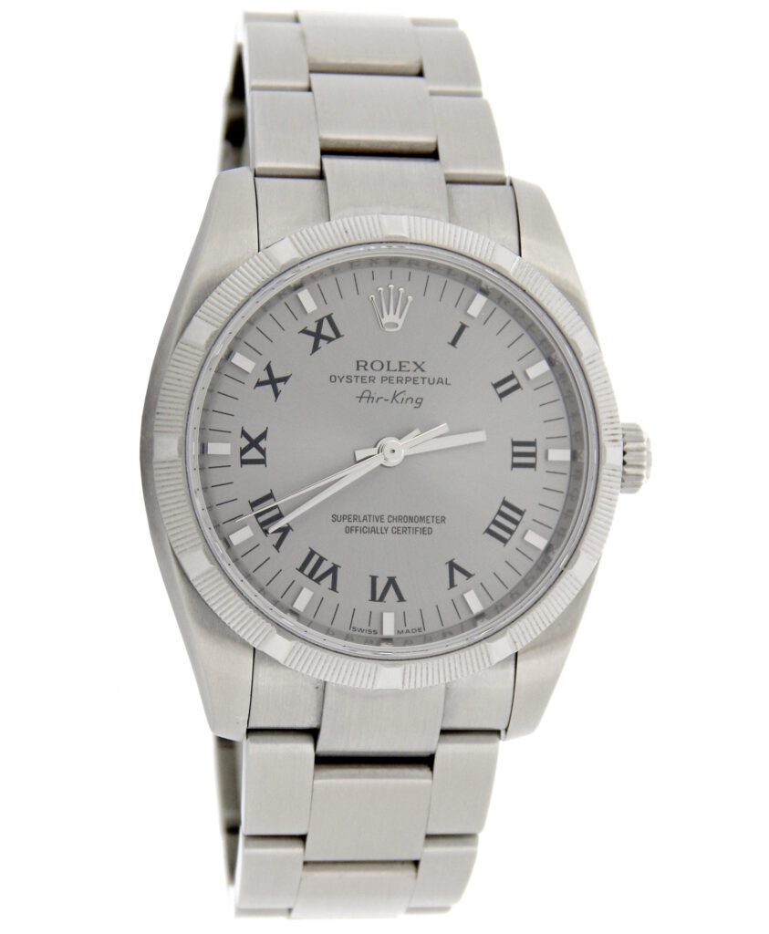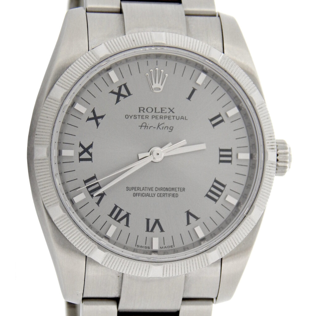 BeckerTime is proud to offer this super nice Men’s 34mm Rolex Stainless Steel Air-King Watch ref #114210 with a Dark Silver “Steel” Roman Dial. This is the most recent 34mm Air-King that Rolex has produced with the heavier SEL Oyster band. This Rolex is in SUPER EXCELLENT CONDITION.