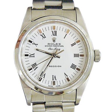 BeckerTime is proud to offer this super nice Men’s 34mm Rolex Stainless Steel Air-King Watch ref #14000 with a White & Black Roman dial. And it get’s better…This is the desired “NO HOLES” model with the SAPPHIRE CRYSTAL and a Rolex Oyster band. This Rolex is in SUPER EXCELLENT CONDITION.