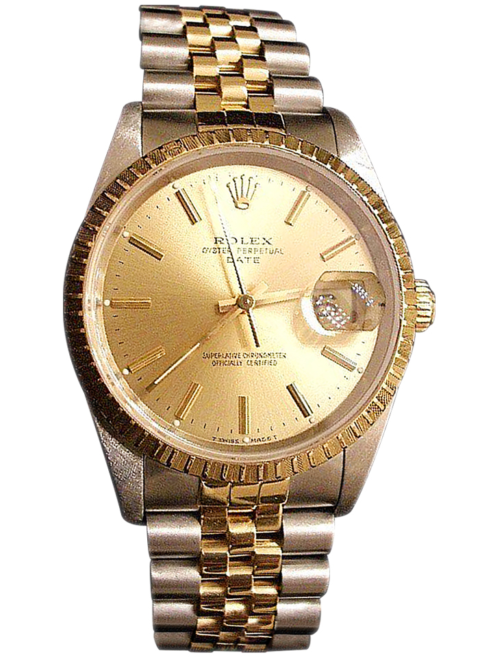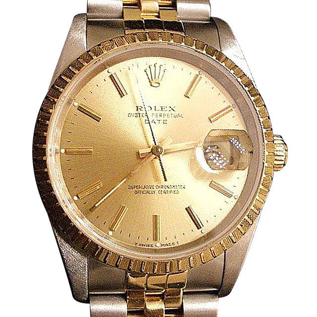 BeckerTime is proud to offer this handsome Men’s 34mm Rolex 2Tone 18K Yellow Gold & Stainless Steel Date Watch ref #15223 with a Gold Champagne Dial. This is the desired QUICKSET MODEL with the SAPPHIRE CRYSTAL and a Rolex Jubilee band. This Rolex is in SUPER EXCELLENT CONDITION.