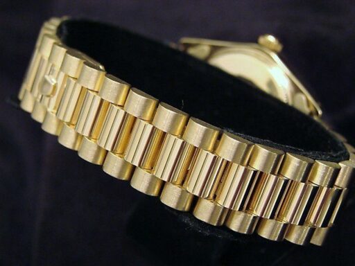 | Band | 14k yellow gold presidential style bracelet with plain hidden clasp. This band is not made by Rolex as it is a custom made aftermarket band of the highest quality. |